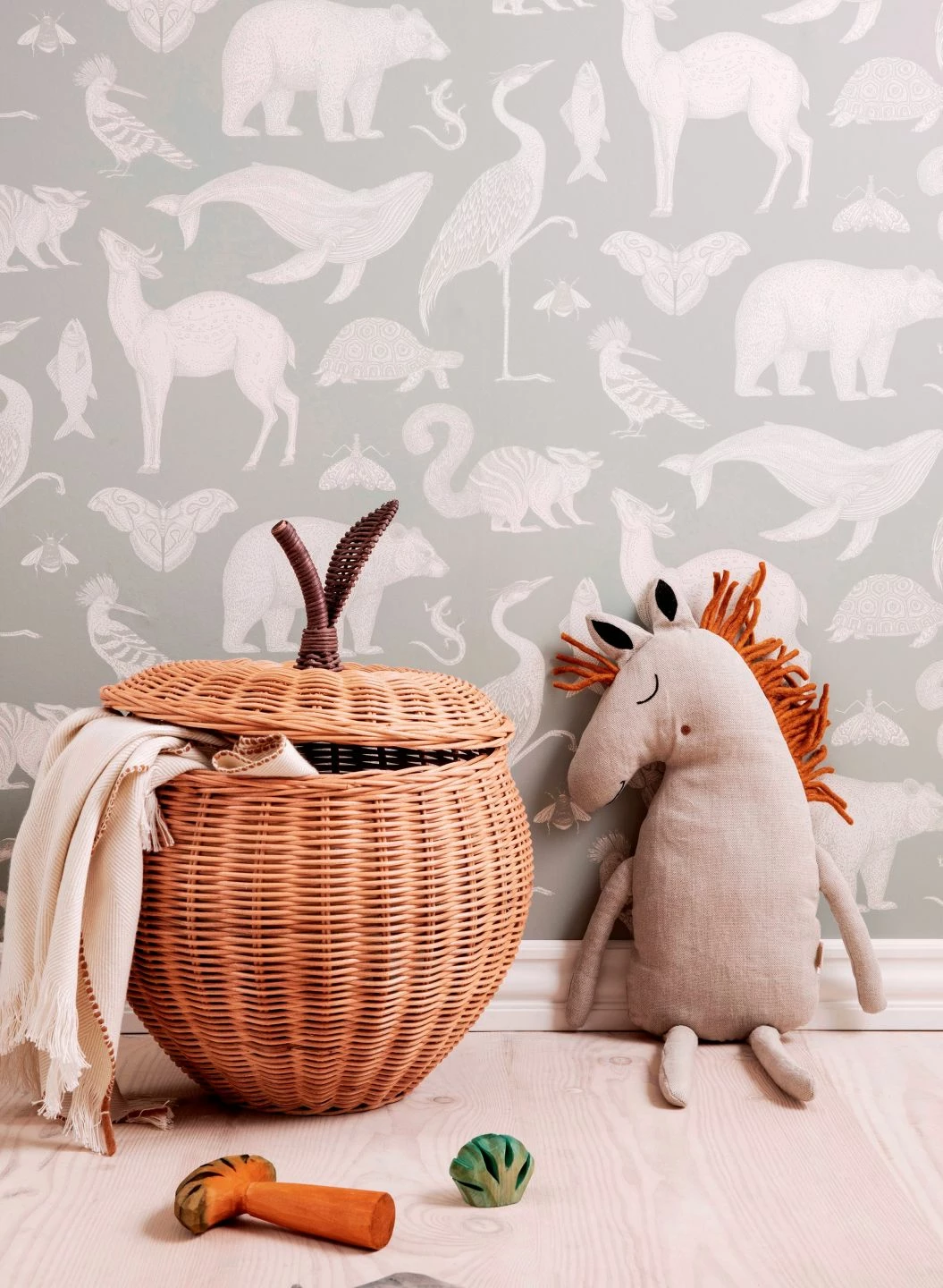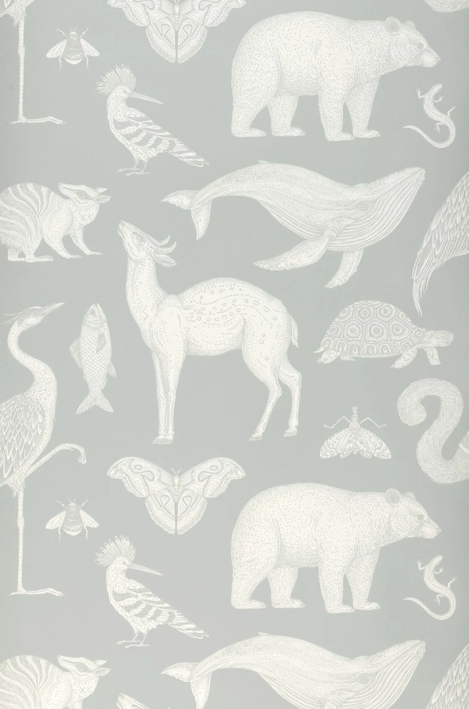 Vom riesigen Blauwal bis zur flinken Eidechse, vom Schmetterling bis zum Braunbär – auf der Designtapete von Ferm Living sind sie alle versammelt und bilden eine reizvolle und anregende Dekoration für ein Kinderzimmer ebenso wie für jeden anderen Raum Ihrer Wahl. Der angenehm geringe Kontrast zwischen dem mintgrauen Grund und den cremeweißen Abbildungen wirkt ruhig und neutral und lässt sich wunderbar kombinieren.