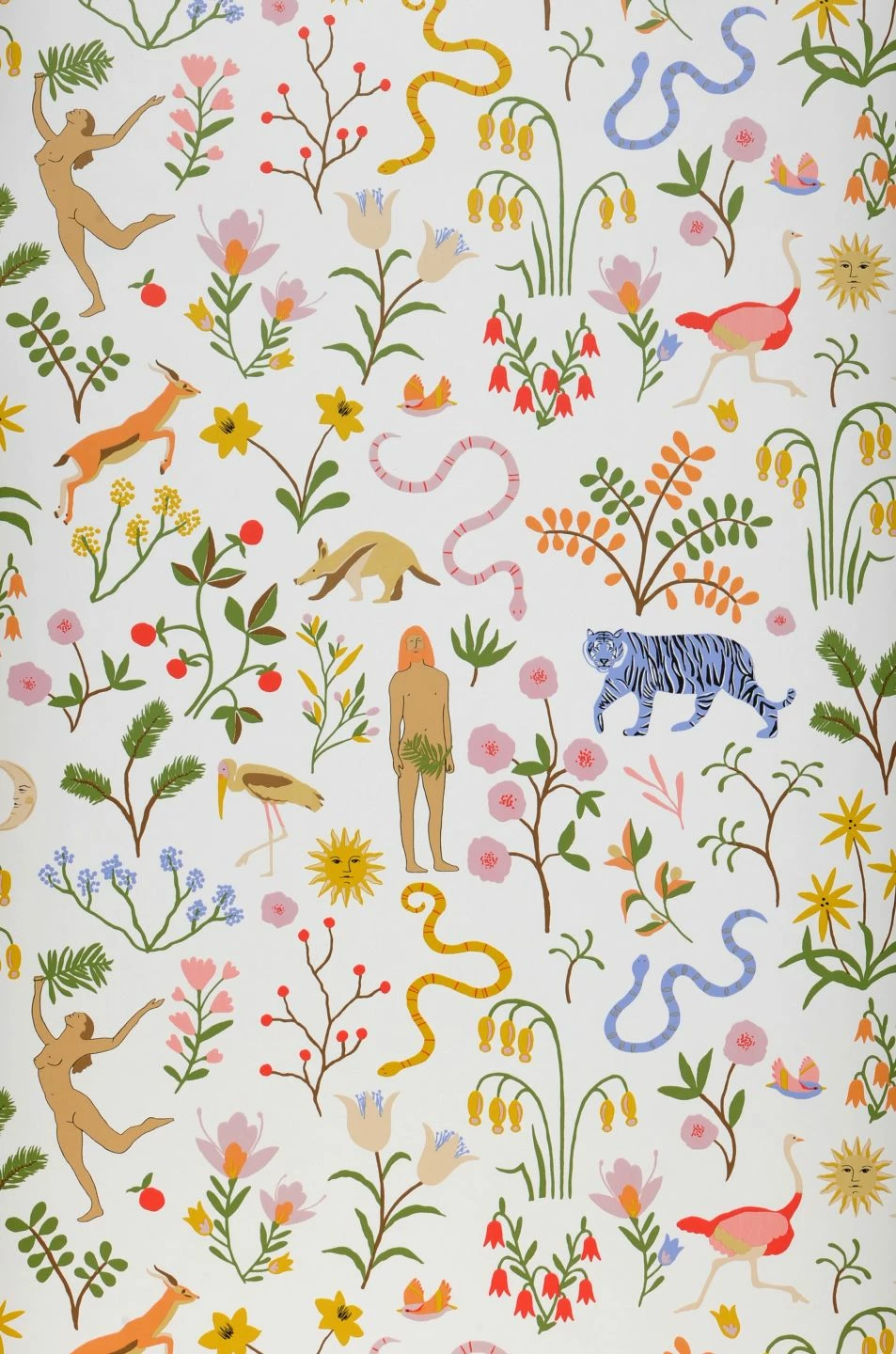 Paradiesische Zustände herrschen auf dieser kreativ gestalteten Vliestapete, die uns mitnimmt in den biblischen Garten Eden. In bunten Farben sind wilde Tiere, Blumen und Bäume, Sonne und Mond und natürlich Adam und Eva wiedergegeben. Auf dem weißen Untergrund leuchten die Farben – auch die der Schlange, die zum Paradies dazugehört – fröhlich und kreieren eine Atmosphäre der Unbeschwertheit!