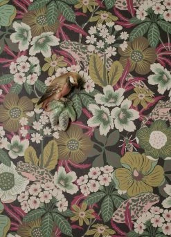 Auf den ersten Blick zeigt Vliestapete Adelia ein üppiges Blütenmeer in perfekt miteinander harmonierenden Ocker-, Grün- und Rosatönen. Erst bei genauerem Hinsehen erkennt man, dass da noch mehr ist: Zwischen den dicht wachsenden Blüten verbergen sich Frösche, deren Hautmuster sie im Blumenmeer beinahe verschwinden lässt, und Insekten. Das Spiel mit der Tradition der floralen Tapete ergibt einen attraktiven Hingucker mit Augenzwinkern.