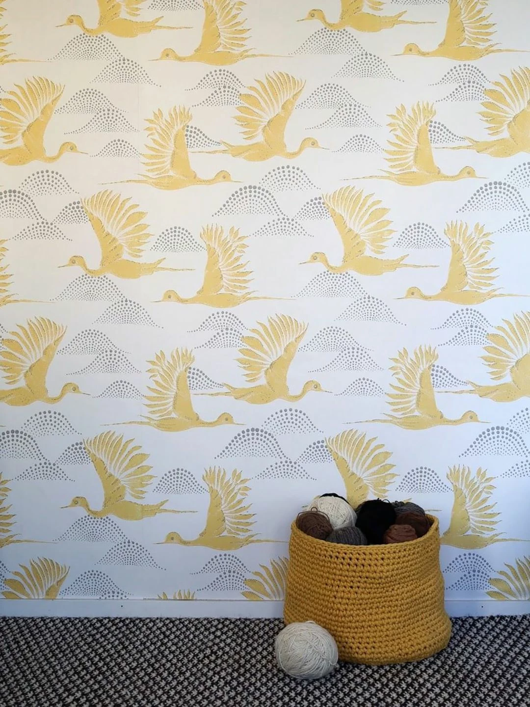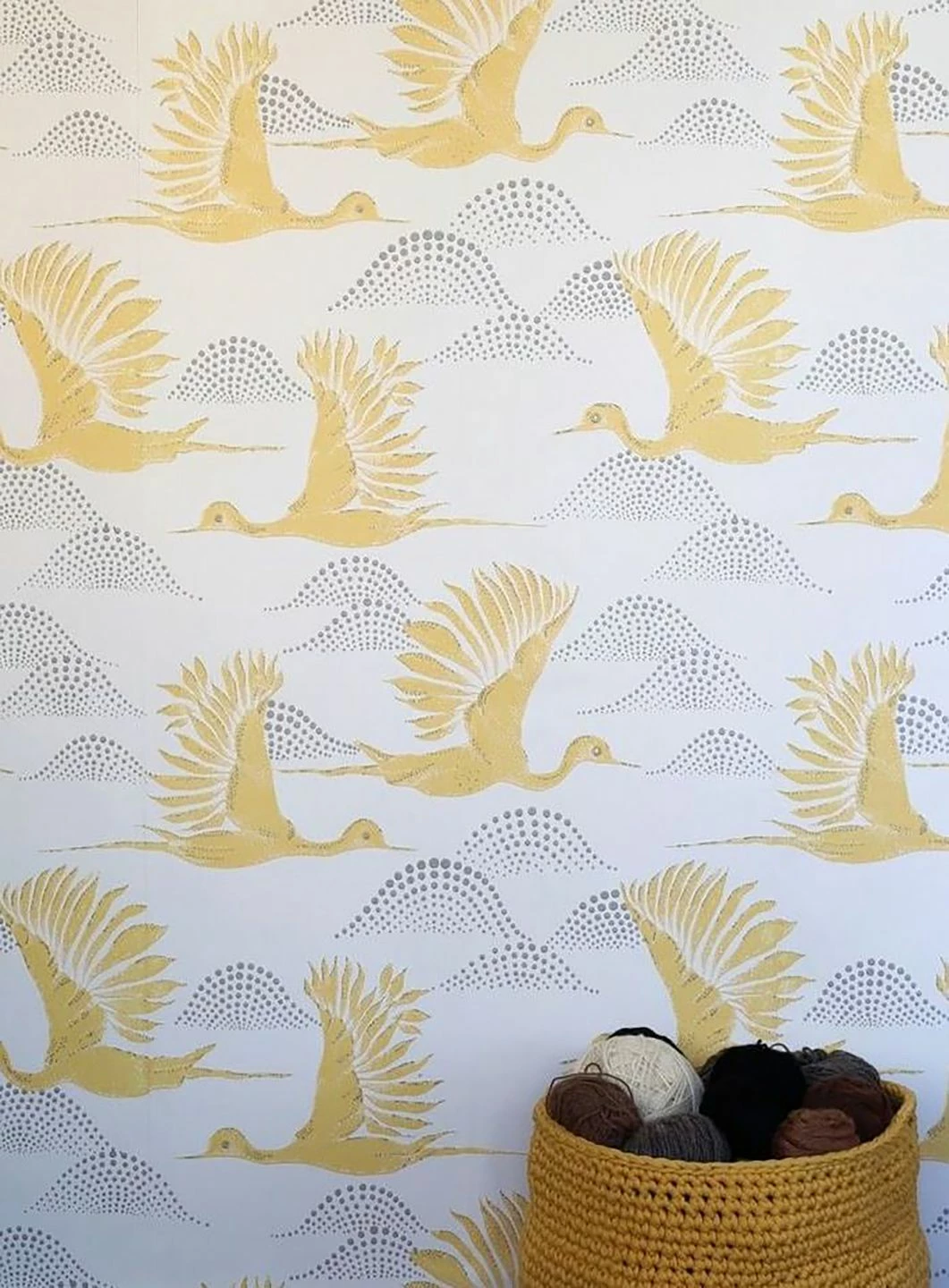 Freundliche maisgelbe Kraniche breiten ihre großen Schwingen aus und fliegen zwischen stilisierten, nur durch hellgraue Punkte angedeuteten Wolken am cremeweißen Himmel. Das Pünktchenmuster der Wolken findet seine Entsprechung in den weißen Tupfen und hellgrauen Punkten, mit denen das Gefieder der großen Vögel verziert ist. Das verwendete Leimdruckverfahren gibt der Papiertapete den Charme traditionellen Handwerks.