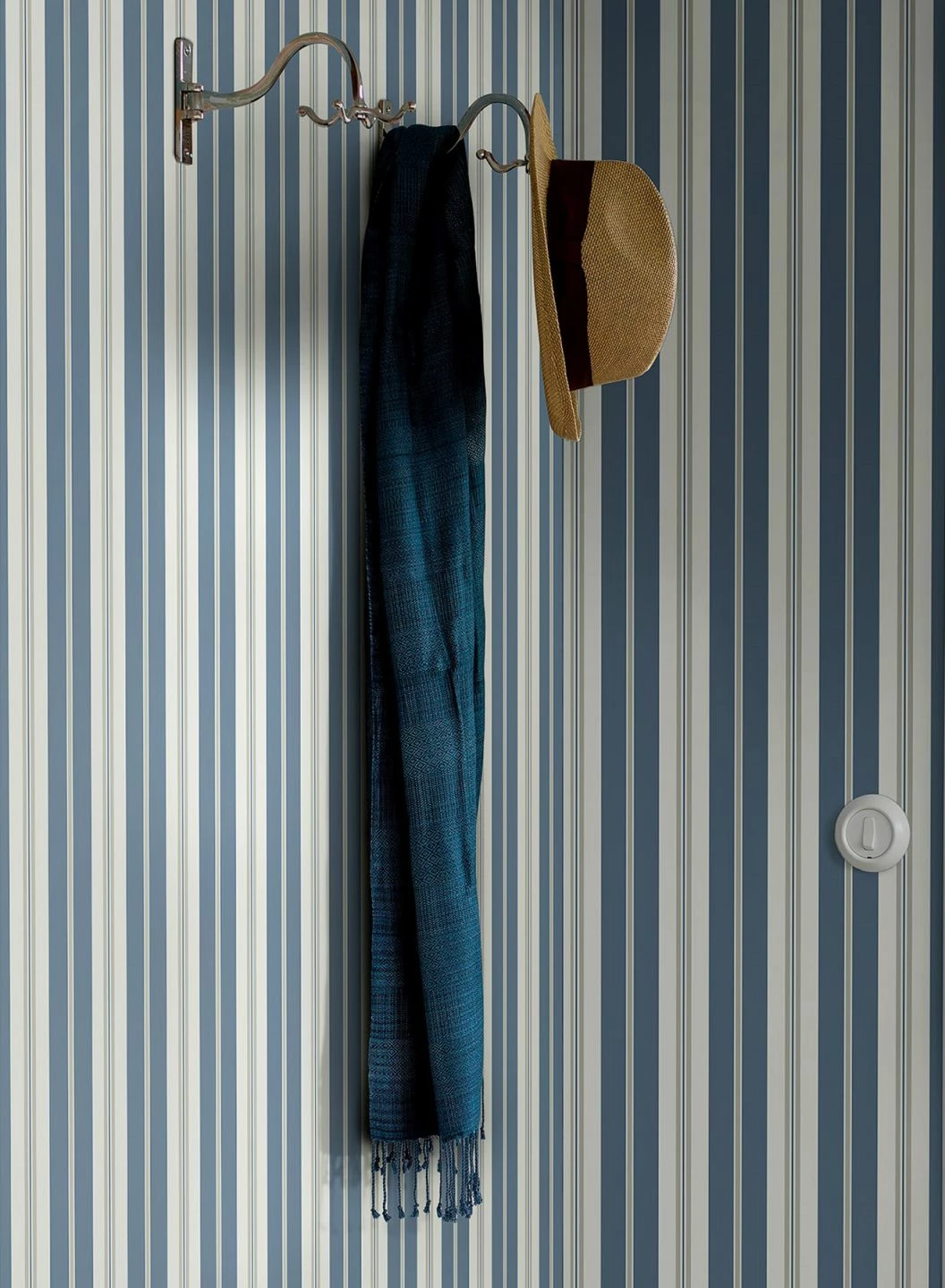 Die interessante Farbkombination ergibt ein kokettes Streifenspiel, welches das Auge des Betrachters mit unterschiedlichen Breitendimensionen verzückt. Der gehobene englische Landhausstil freut sich über das reizende Tapetenmodell aus pflegeleichtem und einfach zu verarbeitenden Vlies. Gut dazu passen stilvolle Messingmöbel und Messingleuchten.