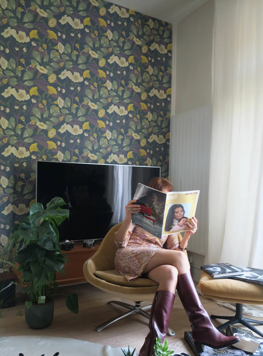 Mit musikalischer Note lenkt die florale Muster Tapete den Blick auf Trompetenblumen, die sich in ihren verschiedenen Blühstadien zeigen. Die stilisierten Blätter und der punktierte Blütenstaub im Hintergrund schwingen fröhlich mit. Die Textur aus Graublau und den Musterfarben in Blassgrün, Gelb, Hellelfenbein, Rotlila verleiht beschwingte Tiefe.