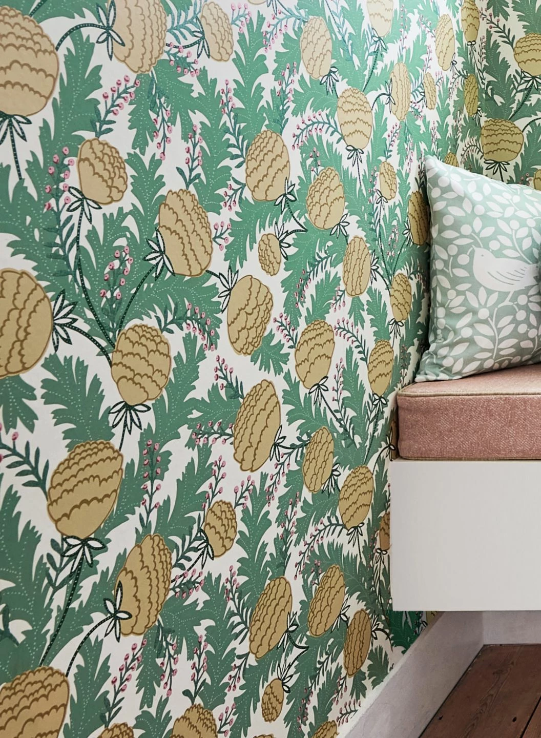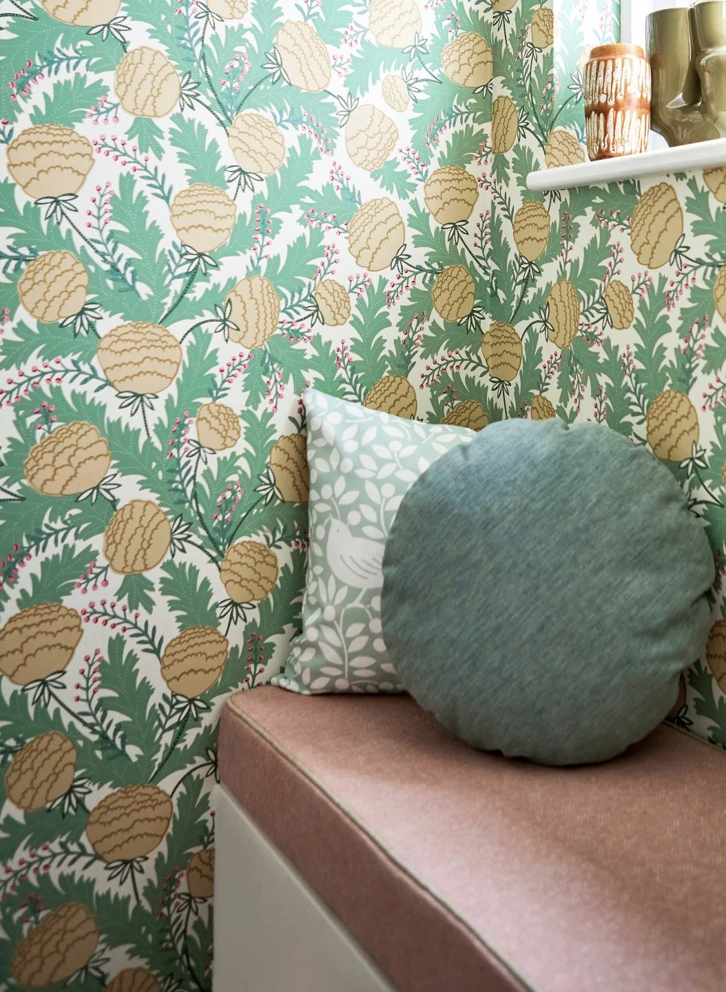 Die Blumenranken auf der floralen Tapete Aranami leben vom Kontrast zwischen den großen, kugelrunden Blüten in Olivgelb und Elfenbein sowie den winzigen, punktförmigen Blümchen in Rosa. Von den sanften blassgrünen Blättern, die den cremeweißen Hintergrund beleben, heben sich die filigranen Stiele der kleinen Blüten ab. Je nachdem, mit welcher der passenden Wandfarben Sie Aranami kombinieren, unterstreichen Sie die rosafarbenen Highlights oder die großen elfenbeinfarbenen Elemente.