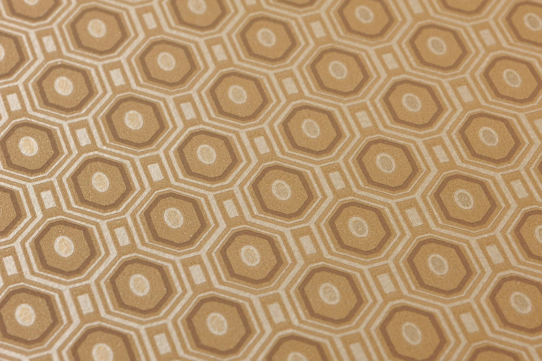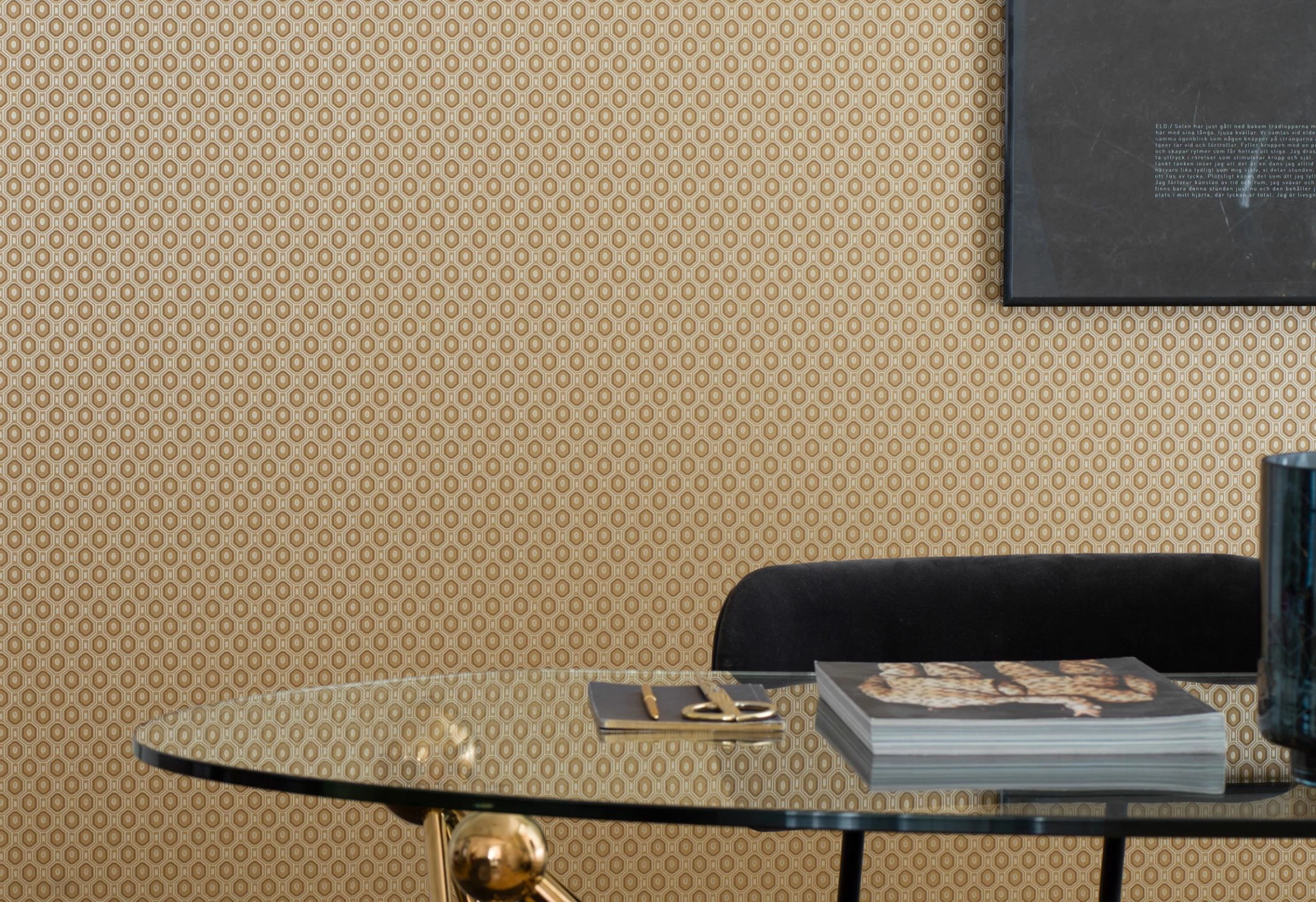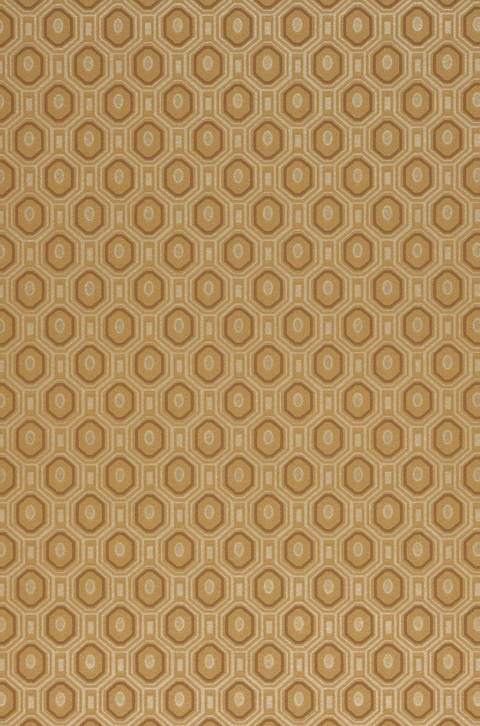 Das kleinformatige Geometriemuster vereint gleich mehrere Effekte in sich. Es lockt das Auge mit optischen Illusionen, die sich aus dem konkreten Betrachtungsabstand ergeben und erzeugt somit immer wieder eine andere Musterdimension. Das schimmernde Muster in Braun, Perlbeige, Perlgold offenbart grandiose Hell-Dunkel und Matt-Glanzeffekte – Ein Meisterstück der suggestiven Eleganz.
