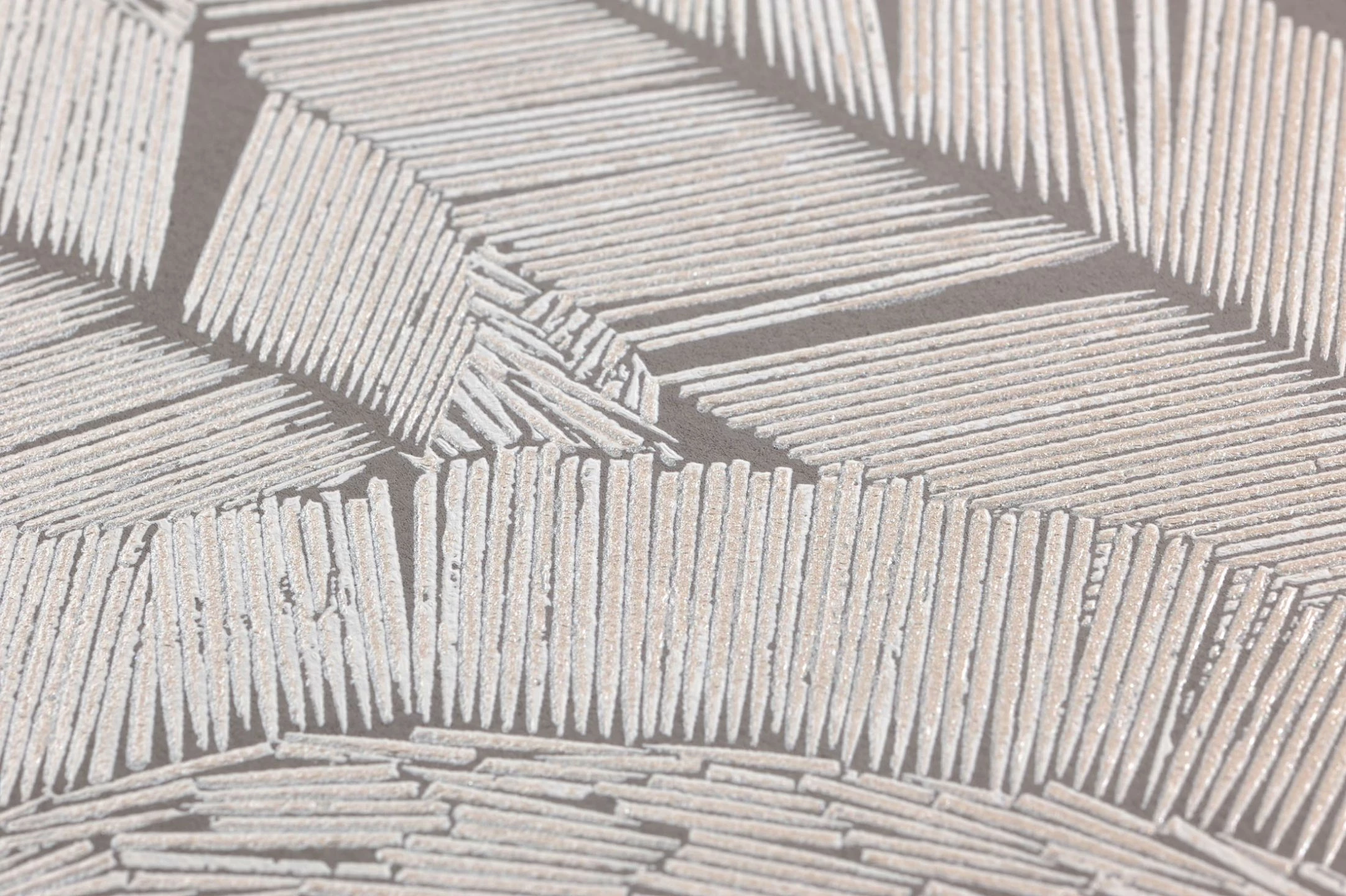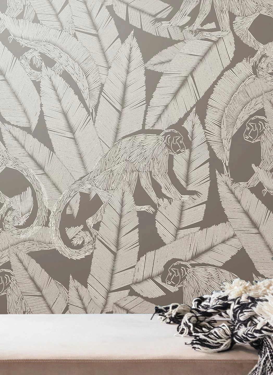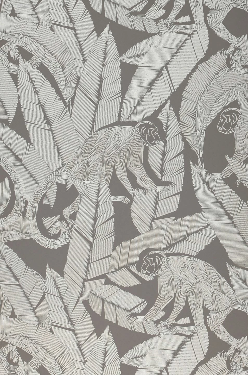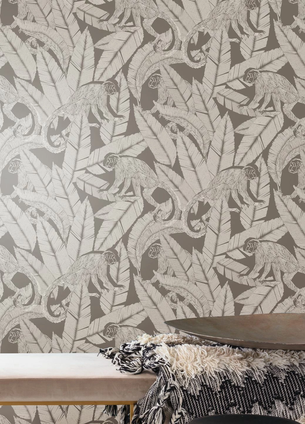 Der Clou liegt hier im Detail. Zwischen schimmernden Blättern werden putzige Totenkopfäffchen und ihr Schattenwurf bei genauem Hinsehen erkennbar. Die ausgefallene Vliestapete mit umbragrauer Grundfarbe und den Musterelementen in Silber Schimmer und Weiß bringt exotisch angehauchte Einrichtungsideen auf die kreative Palme.