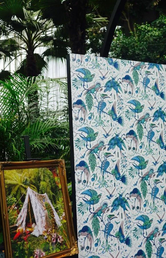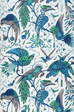 Tropische Muster beflügeln die Sinne und wecken Reiselust. Romantische Exotik strahlt Designtapete Audubon in karibischen Farben wie Capriblau, Grauviolett, Grün, Pastelltürkis Schimmer, Türkisblau aus. Schon eine Akzentwand genügt, um die erholsame Wirkung der aufwendig gestalteten Mustertapete zu spüren. (Volturi)