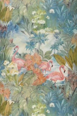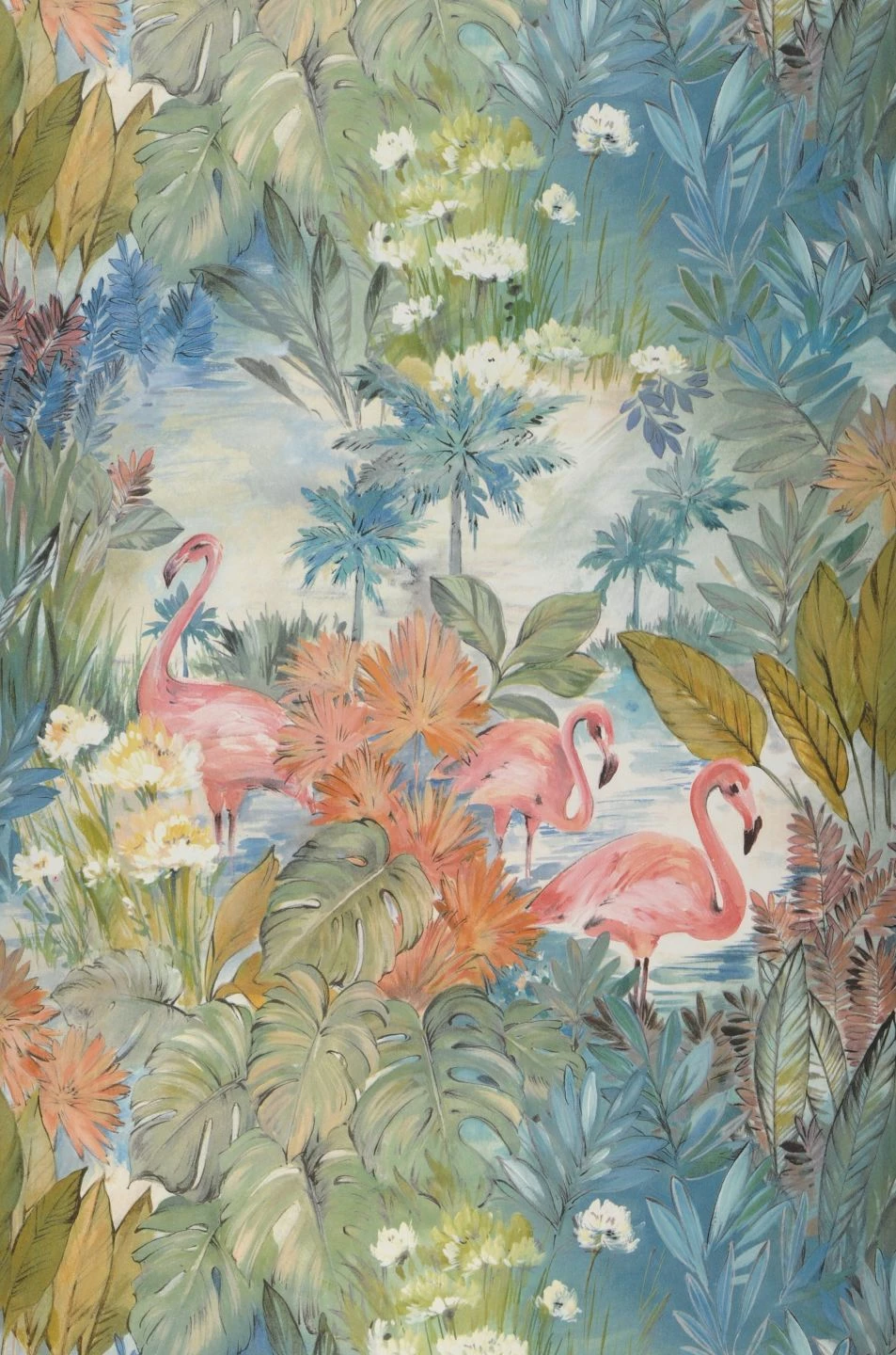 Kräftig altrosafarbene Flamingos, detailreich und realitätsnah gezeichnet, stehen in einer exotischen Landschaft zwischen Palmen, Blattpflanzen und Blumen. Durch geschickten Einsatz der Größenverhältnisse und Farben spielt die Tapete Bahia wirkungsvoll mit Vordergrund und Hintergrund, die sich fast unmerklich vermischen. Farbenfroh und voller Lebenskraft schmückt die Tapete den Raum ihrer Wahl mit ihrem sehnsuchtsvollen Blick in ein fernes Land.