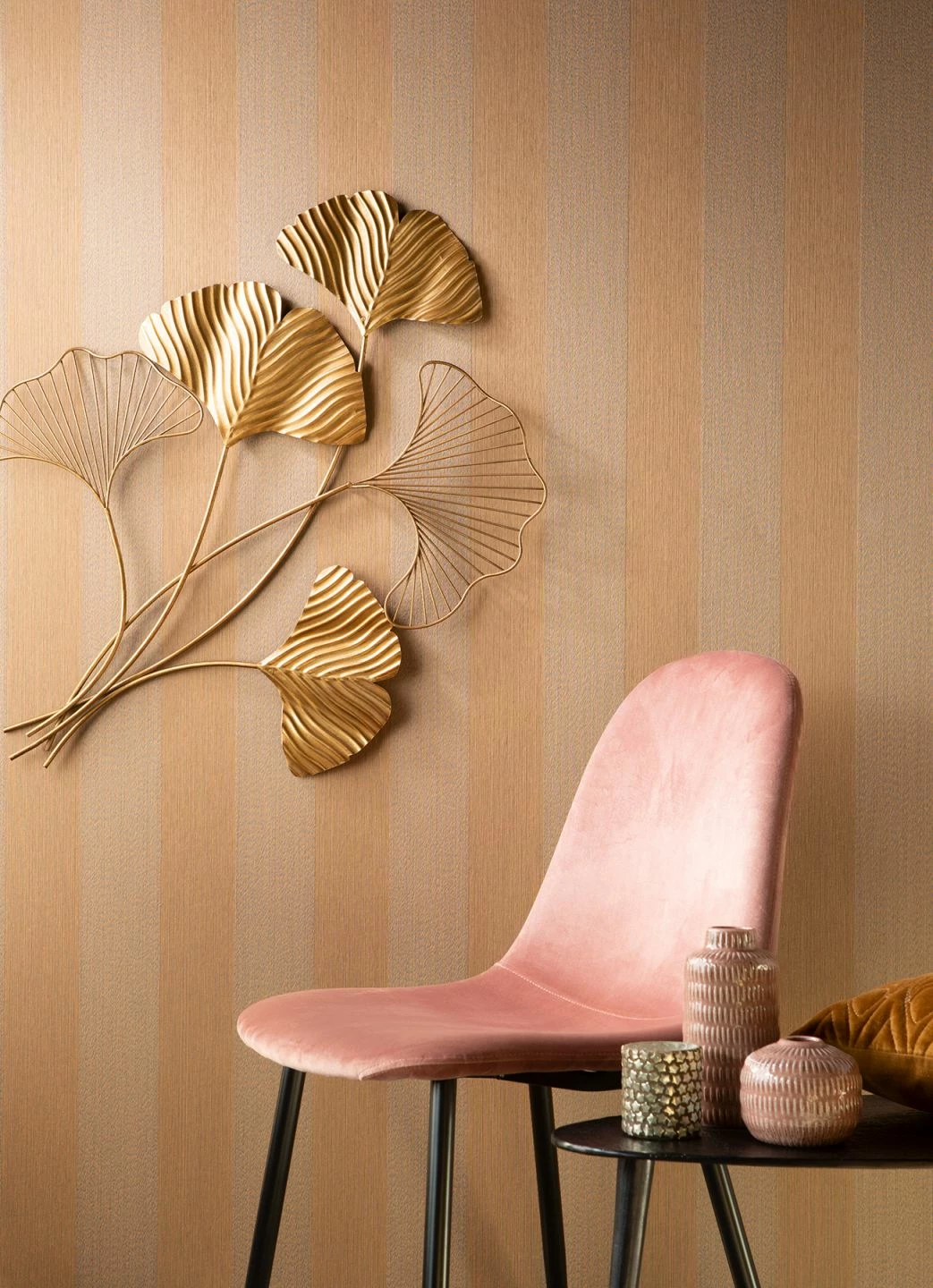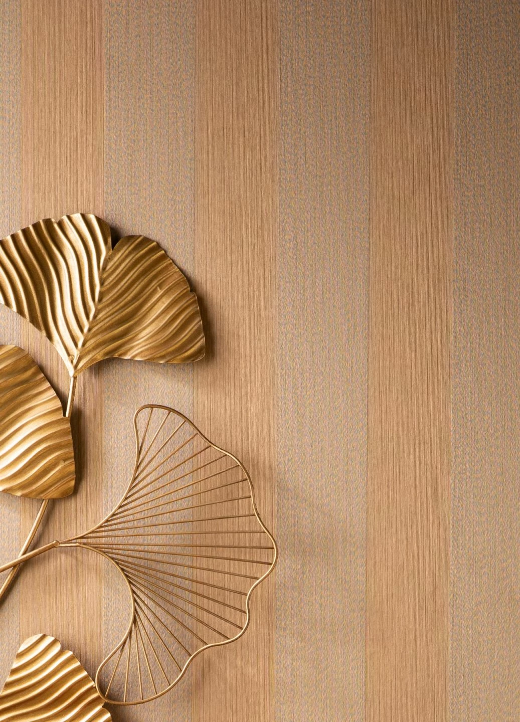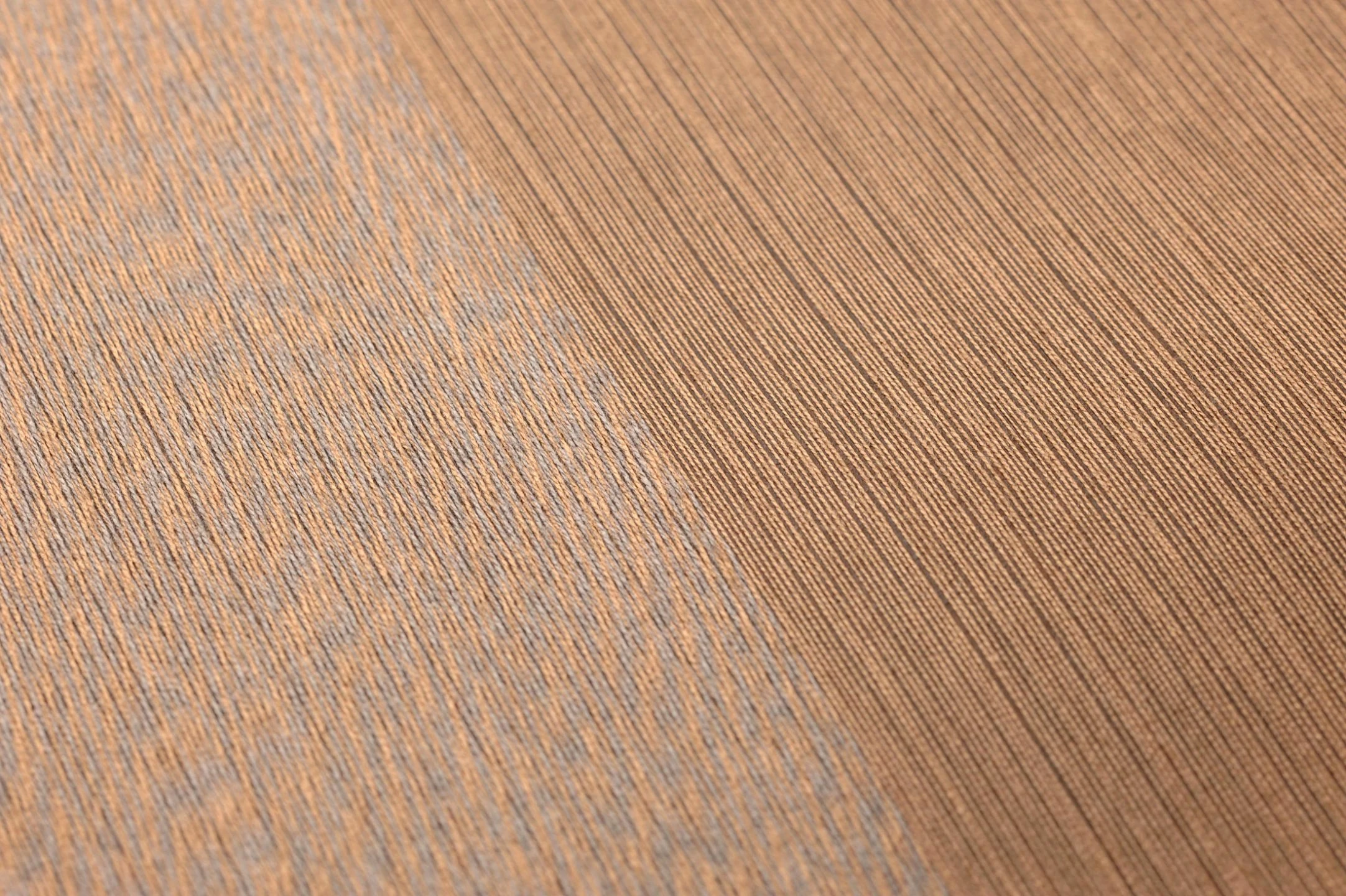 Gleichmäßige breite Streifen in zwei freundlichen Nuancen von Blassbraun, vermischt mit sanftem Grau, bilden das Muster dieser hochwertigen Textiltapete. Das Oberflächenmaterial aus edlen Kettfäden schimmert leicht und strahlt gemütliche Wärme aus, ohne seinen eleganten Charakter zu verlieren. Kombinieren Sie die Vliestapete ganz nach Ihren Wünschen mit den passenden Farbtönen aus dem Textilmaterial oder kontrastieren Sie mit kräftigen Farbtönen.