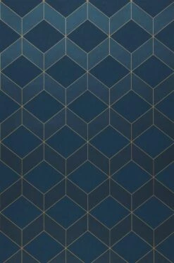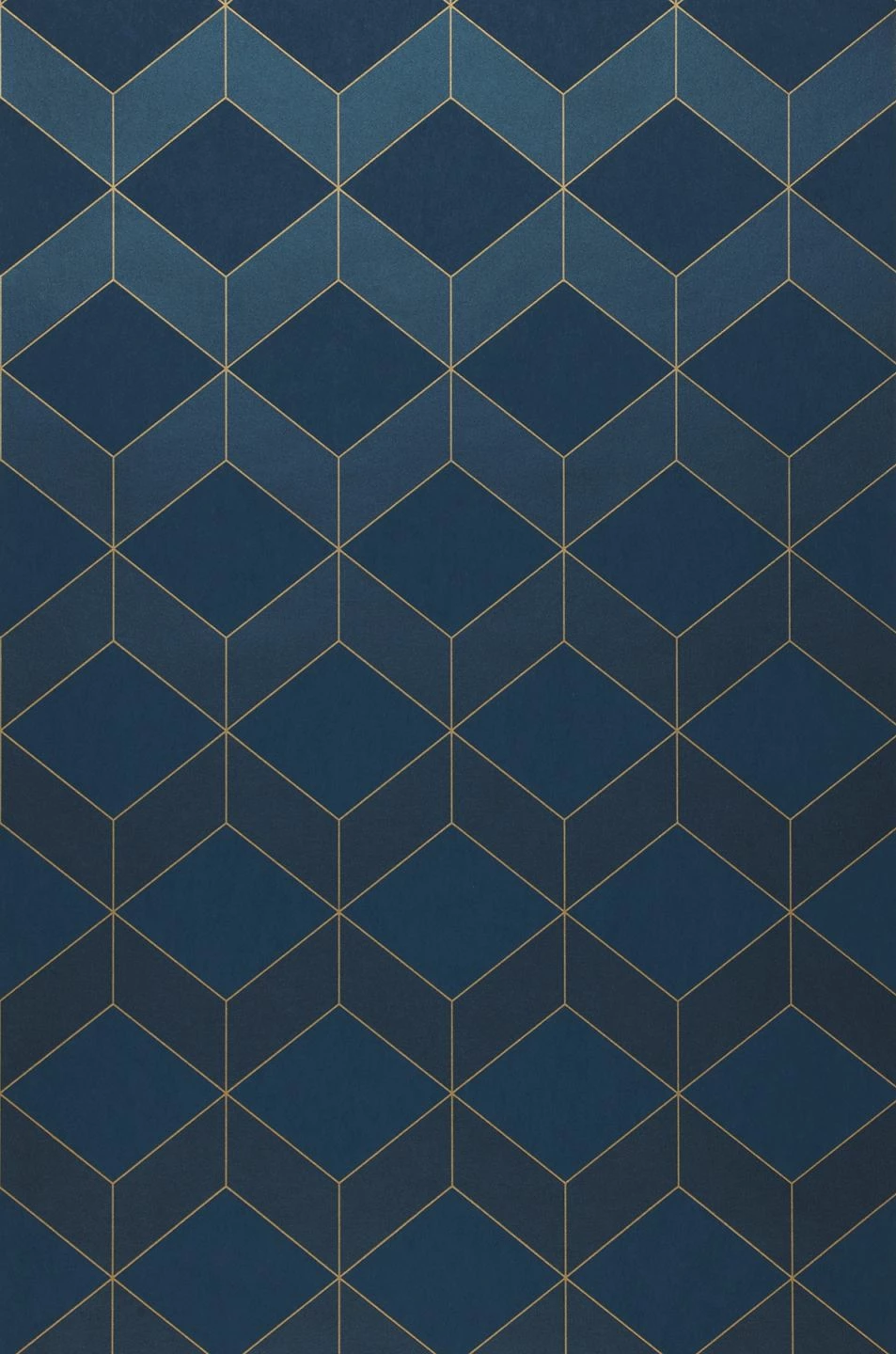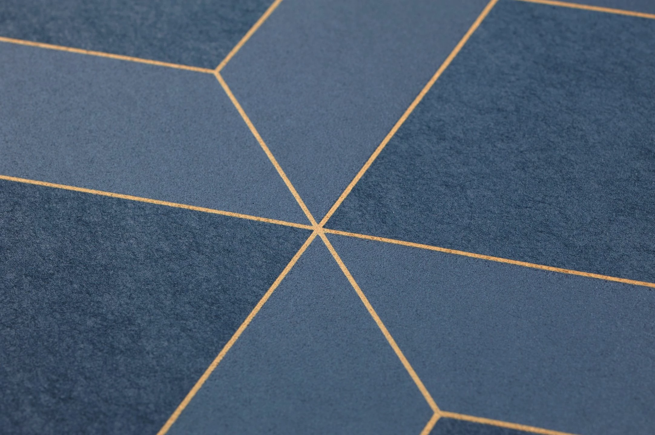 Durch das Zusammenspiel schimmernder und matter Blautöne, begrenzt durch schmale Linien in goldener Farbe, entstehen gleichmäßige Rauten und Trapeze. Diese spielen mit der Fläche der Wand und erzeugen einen dreidimensionalen Effekt räumlicher Tiefe. Die Art-Deco-Tapete strahlt durch ihre blaue Farbe Ruhe und Belebtheit gleichermaßen aus und kreiert einen außergewöhnlichen Raumeindruck. Mit goldfarbenen Deko-Elementen greifen Sie das Schimmern der goldenen Linien perfekt auf.