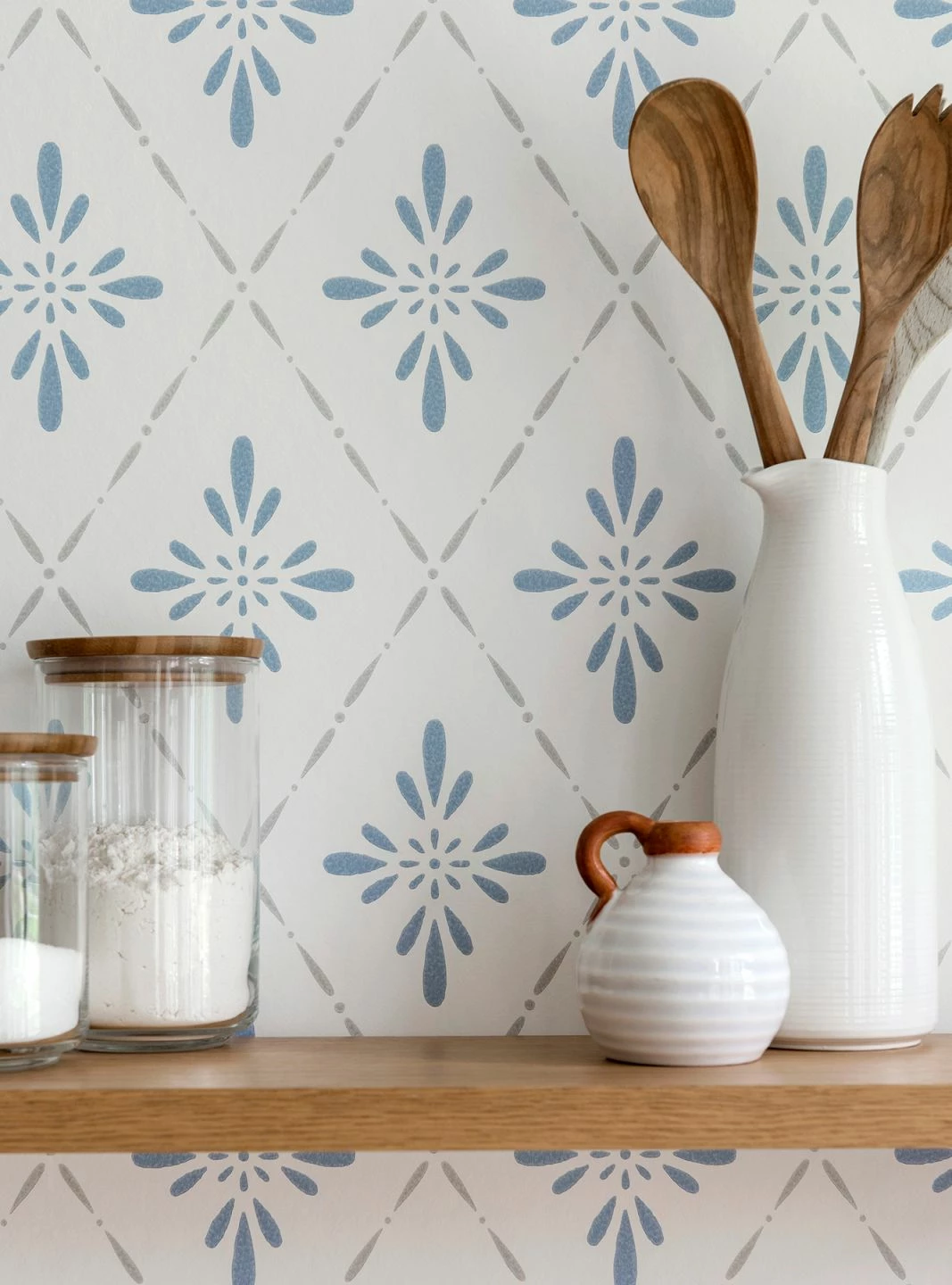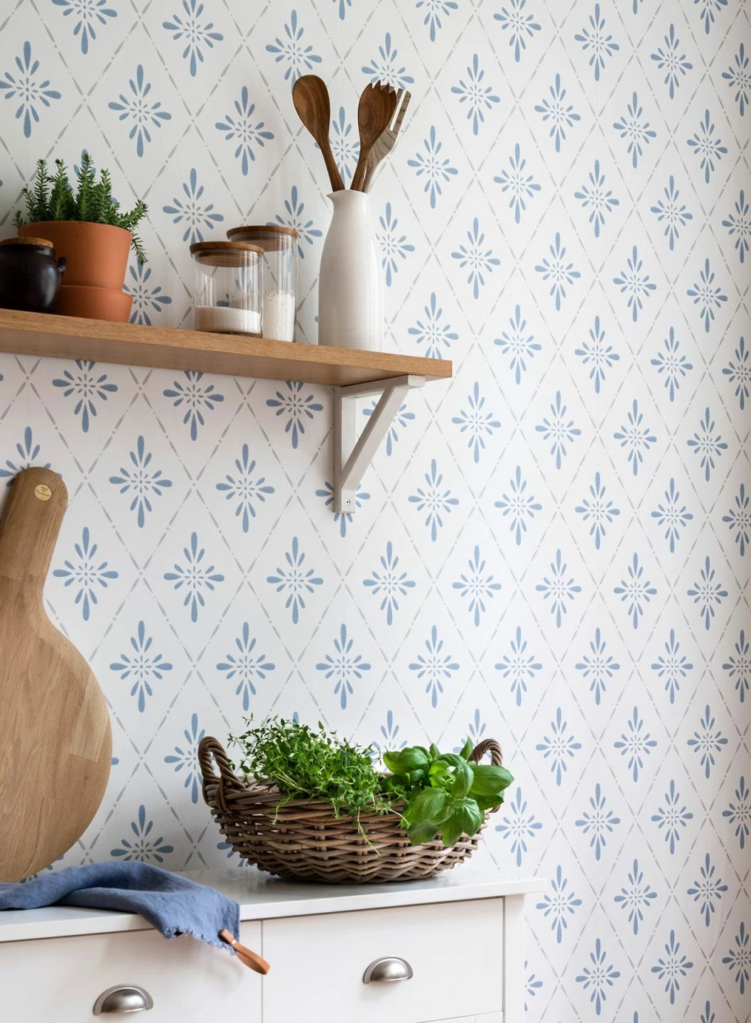 Wir lieben den Landhausstil mit seiner Extraportion Romantik und Nostalgie. Erinnerungen kommen auf an Omas Küche beim Anblick der reizvollen Geometrie-Tapete. Stilisierte Blüten sind in (Rauten)Form gebracht und strahlen in Blau-Weiß um die Wette. Jetzt fehlen nur noch das antike Küchenbuffet sowie der feine Apfelkuchen und das Glück auf dem Lande ist perfekt.