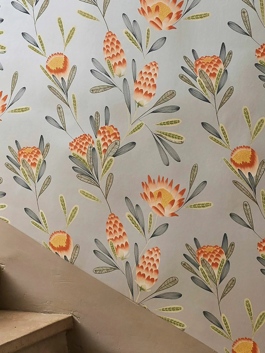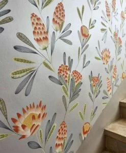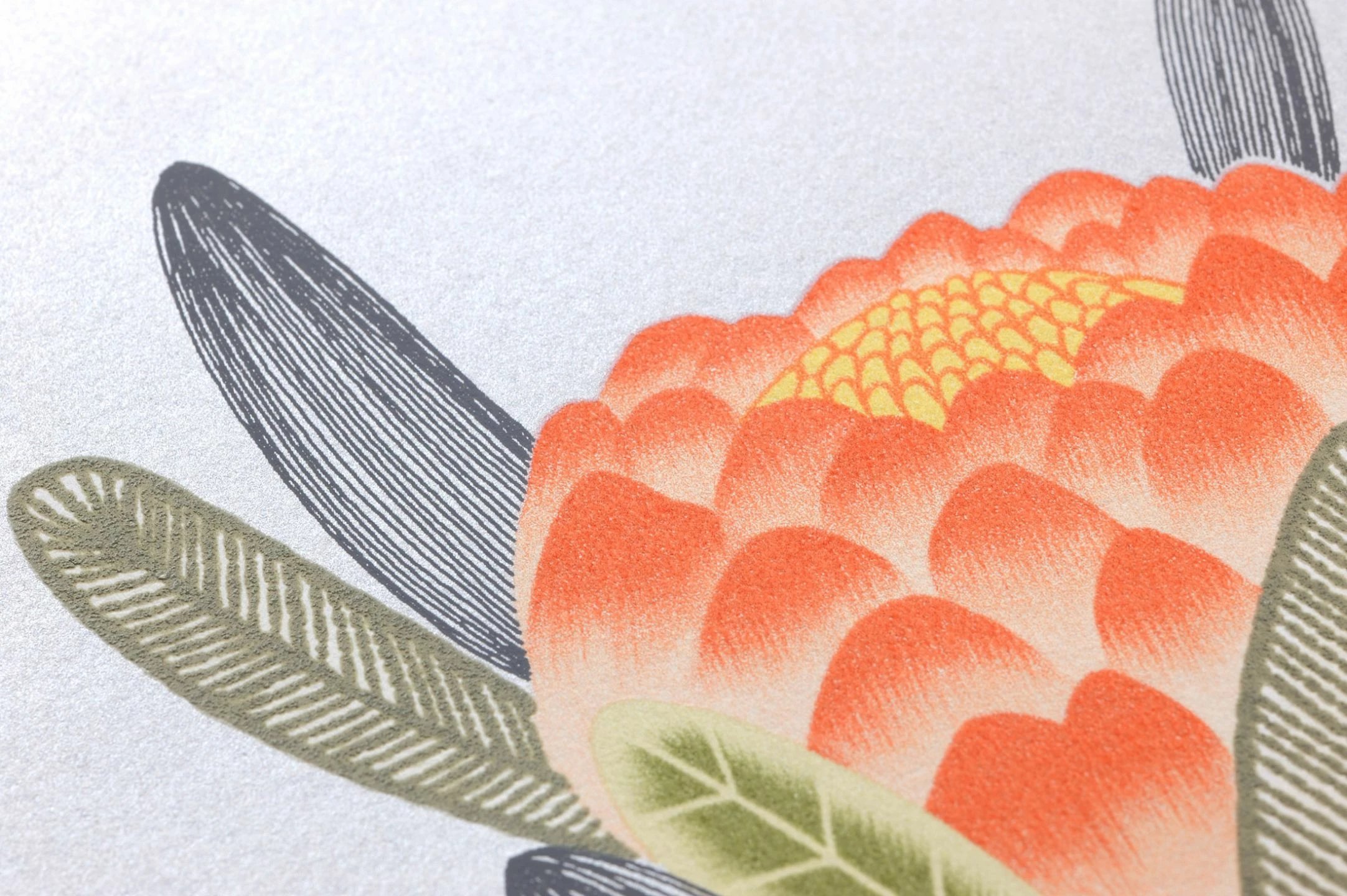 Raffinierte Farben, Fantasieblumen und schimmernde Effekte zeichnen diese florale Tapete aus. Fruchtiges Rotorange, natürliches Schilf- und Farngrün sowie Steingrau bilden eine harmonische Einheit. Aluminium-Weiß setzt mit zart-glänzender Struktur ein spaciges Highlight. Durch die abwaschbare Oberfläche ist Beda auch in Räumen mit stärkerer Beanspruchung ein Augenschmaus.