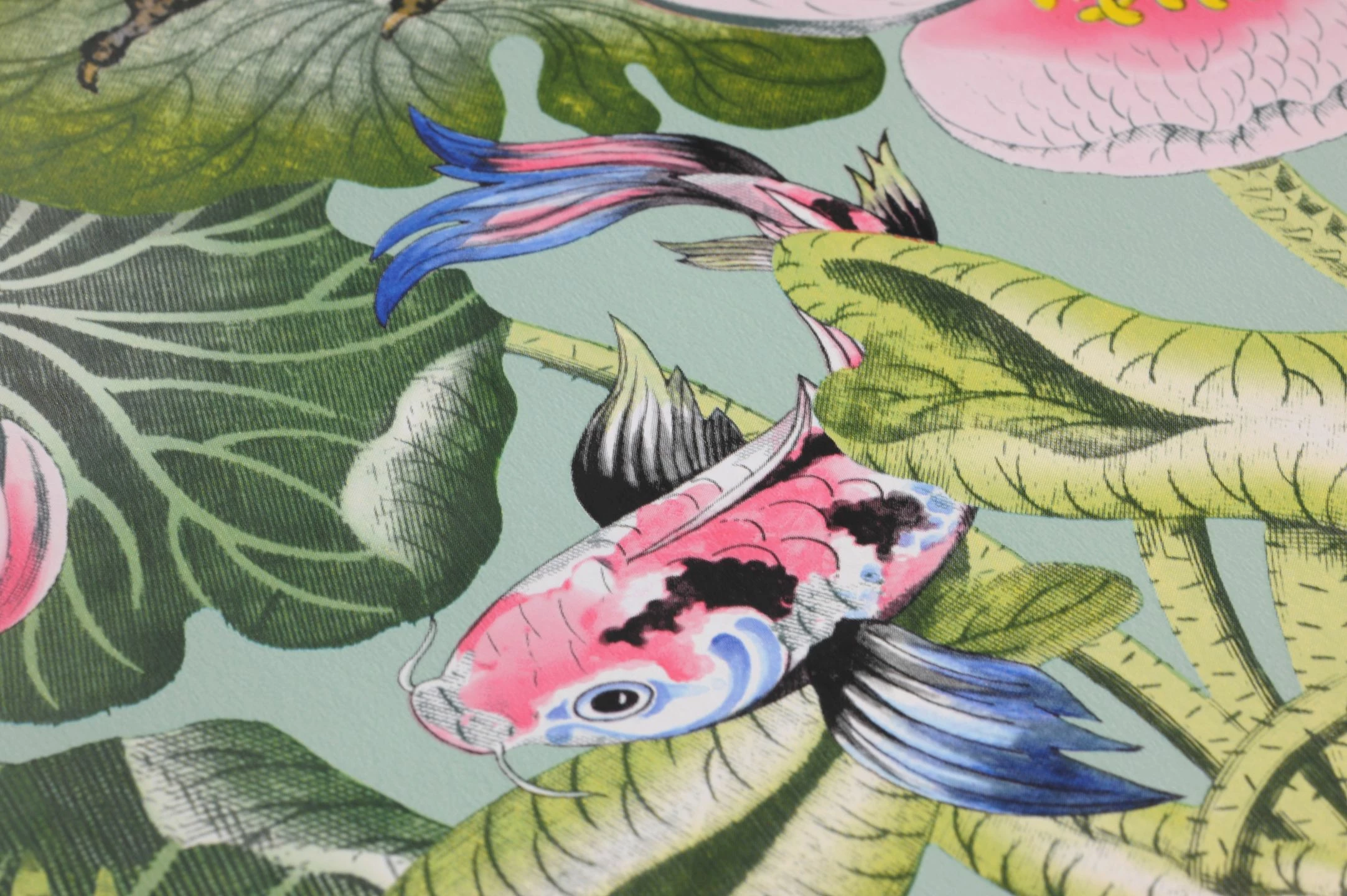 Wasser ist Leben – und Vliestapete Bellevue zeigt die Vielfalt des Lebens an und in einem orientalischen Gartenteich in seiner ganzen Pracht. Seerosen, Lotusblumen und Fische, Schmetterlinge und große Wasservögel beleben Ihre Wand mit einem faszinierenden Spiel mit den Größenverhältnissen und in phantasievoller Vermischung von Oben und Unten. Die verschiedenen Grüntöne, Weiß und Rosa schaffen eine freundliche Umrahmung für orientalische oder auch Landhaus-inspirierte Einrichtung.