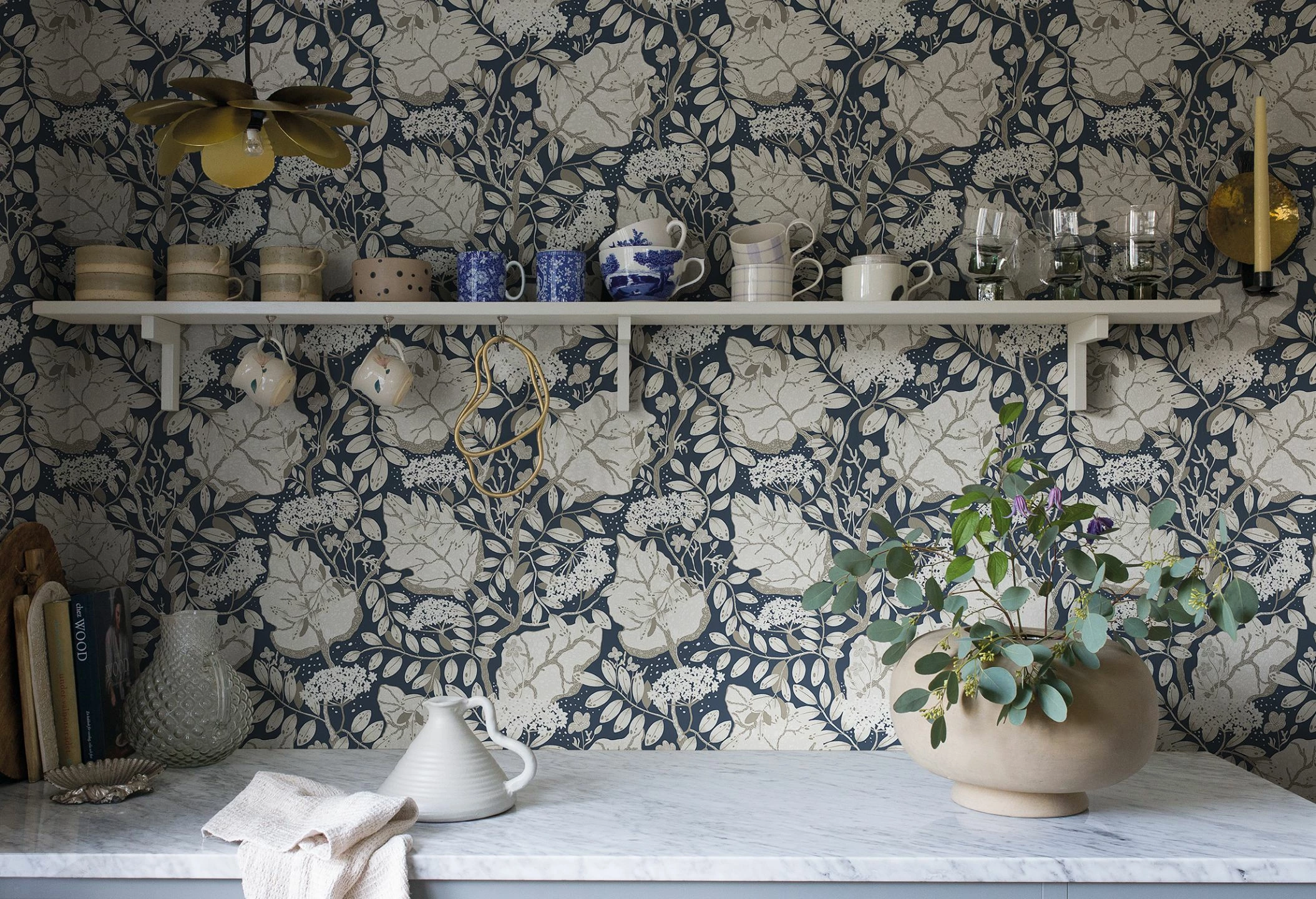 Große Blätter und zierliche Blüten prangen in Cremeweiß, Grautönen und Zartblau auf graublauem Grund. Durch Details in den verschiedenen Farbtönen erhalten die Blätter ein lebendiges Aussehen. Der dunkle Hintergrund steuert Ruhe zur üppigen Vegetation bei. Die blau-weiße Anmutung passt wunderbar in ein helles Schlafzimmer, ein Wohnzimmer oder auch in eine große Küche.