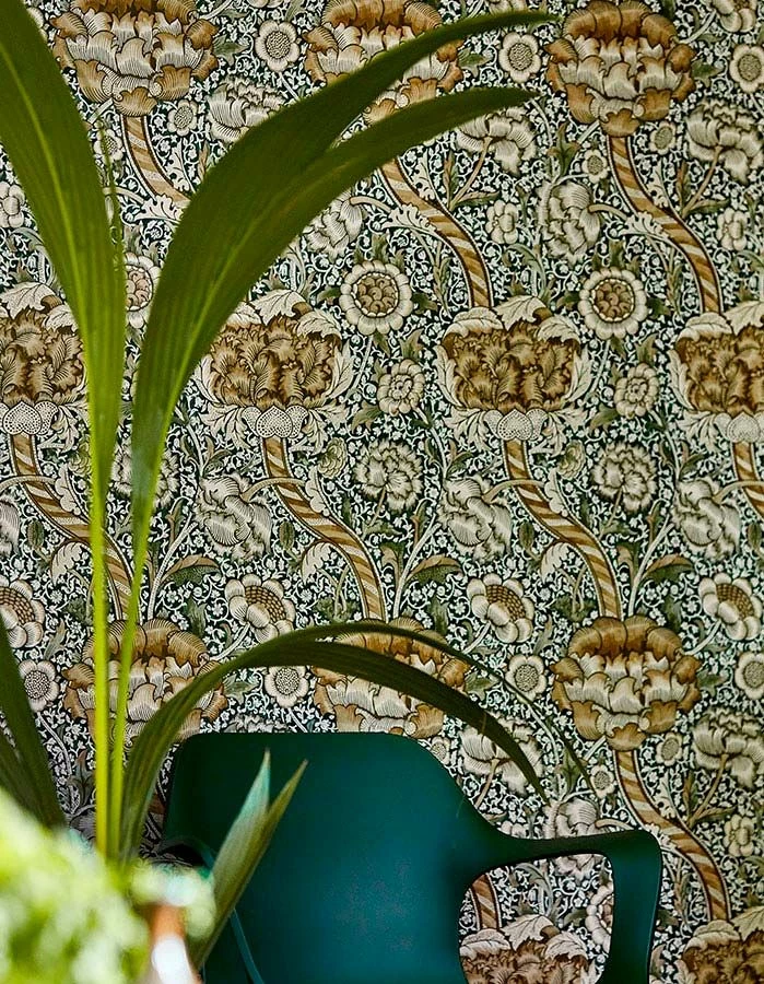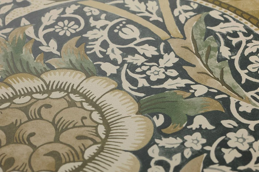 Dunkelgrün, Grünbraun, Hellelfenbein, Khaki, Olivgrün – Bevorzugte Farben der hochwertigen Gobelins und Wandteppiche des Spätmittelalters zieren die zauberhafte Design Tapete mit floralem Renaissance-Muster. Erfinden Sie Ruheräume neu, in dem Sie Stilepochen mixen, z.B. die üppige Renaissance und den designorientieren Mid-Century-Stil.
