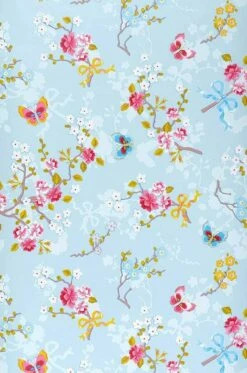 Schattierte Blütenzweige mit Schleifen und bunten Schmetterlingen auf blassblauem Grund verbreiten eine freundliche Stimmung, die jeden Raum zum gemütlichen Rückzugsort macht.