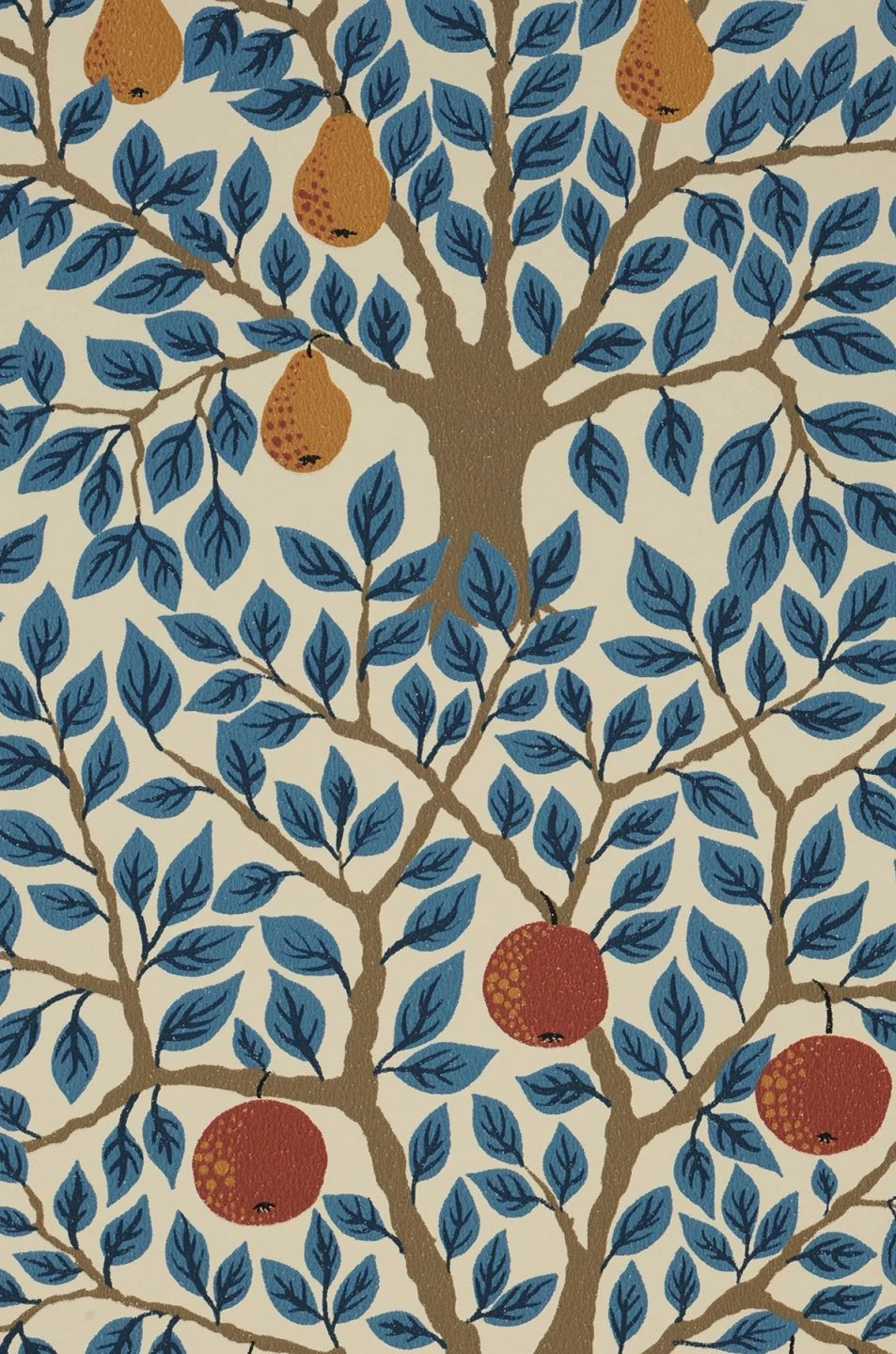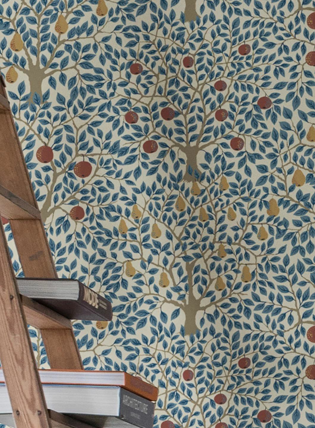 Von der exotisch-mediterranen Farbmuse geküsst, präsentiert sich diese Variante der floralen Tapete Berita. Azurblau, Blassbraun, Braunbeige und Braunrot lassen die Musterelemente auf weißem Grund förmlich miteinander verschmelzen. Aus der Ferne betrachtet, wirkt das Design wie abstrakte Kunst, das sich bei Nahsicht in einen Obstgarten verwandelt.