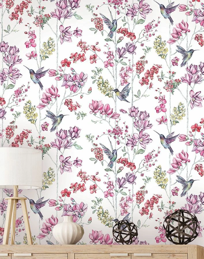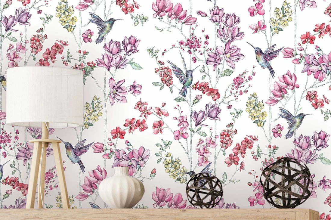 Exotische Kolibris in Paradiesfarben mit einer Blütenrankenpracht in Rot-, Violett, Magenta, Gelb und Grün setzen auf dieser weißgrundigen Variante der exklusiven Design Tapete Biala ein Understatement für Romantik mit Signalwirkung.