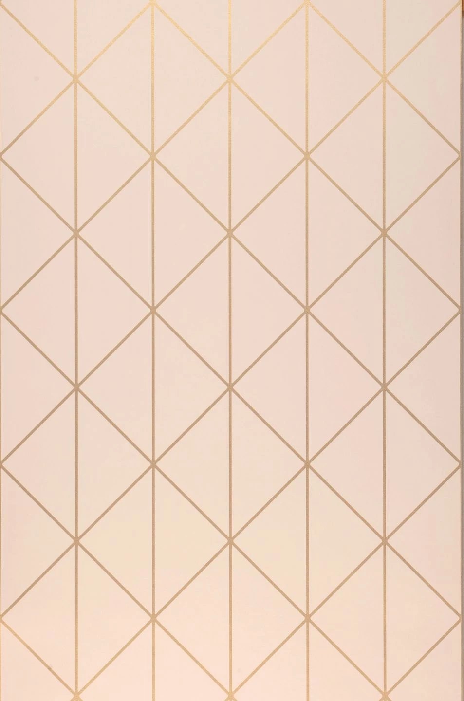 Feine Linien in schimmerndem Perlgold verlaufen senkrecht und diagonal über die zartrosa getönte Fläche der Tapete. Zusammen bilden sie ein elegantes, symmetrisches Muster im Art-Deco-Stil. Dreiecke, Karos und Parallelogramme entstehen aus dem Zusammenspiel der Linien und unterteilen die Fläche Ihrer Wand. Die Kombination aus Zartrosa und Gold wirkt dezent luxuriös und strahlt bei aller Sachlichkeit des Art Deco einen Hauch von Romantik aus.