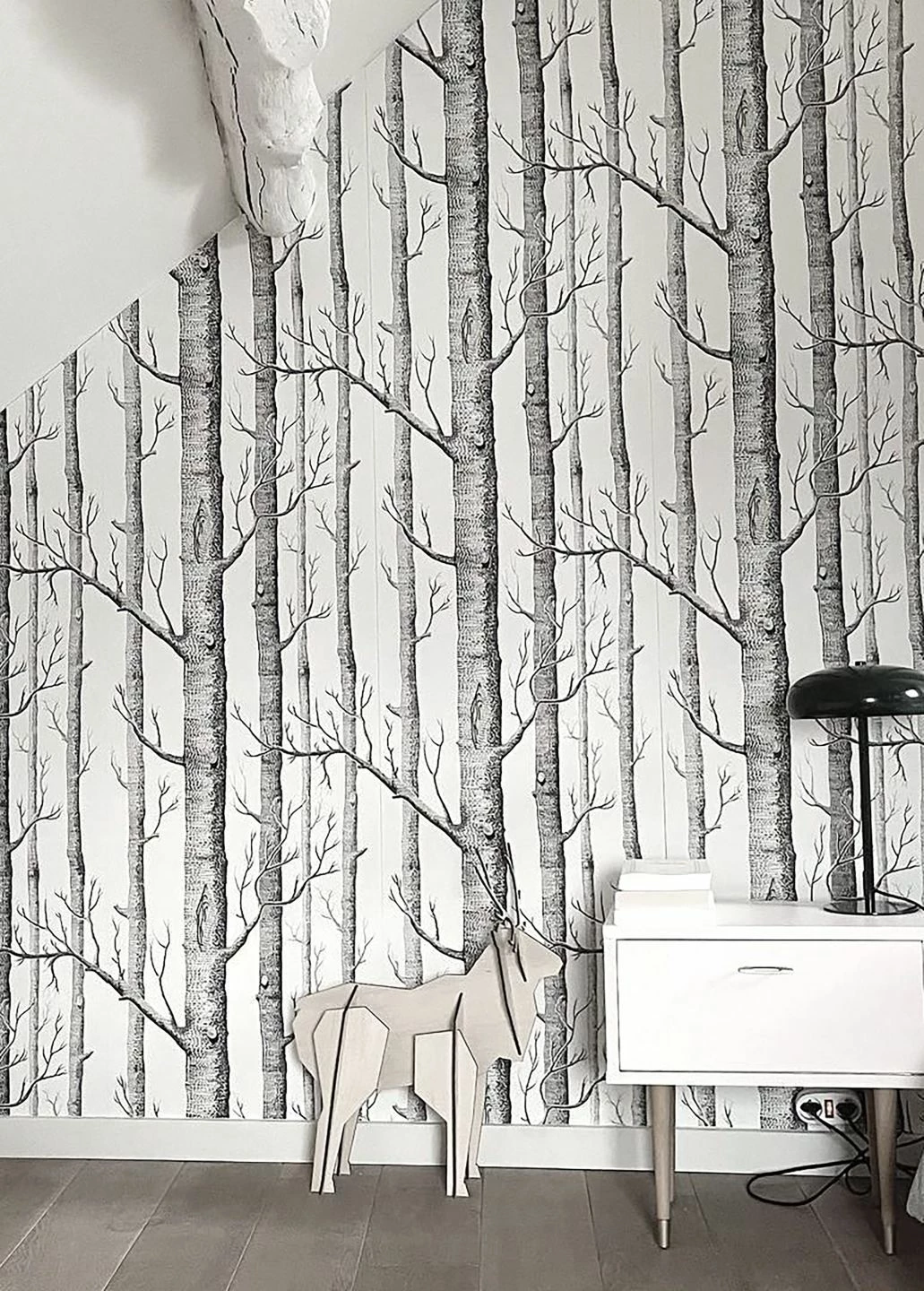 In diesem Wald stehen Sie goldrichtig, denn es ist nicht nur ein gezeichneter Baumwald, sondern ein grafisches Kunstwerk, das sich aus Punktlinien und Strichen zusammensetzt und dem Raum mythische Tiefe verleiht. Schwarz und Weiß lassen die Konzentration auf das Wesentliche zu – in diesem Kontext die Ruhe und Würde, die der Szenerie innewohnt.