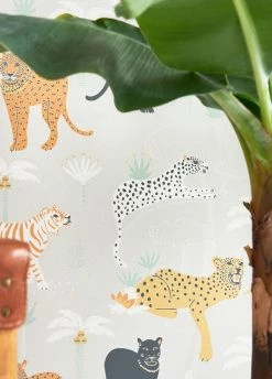 Welches Kind wäre nicht beeindruckt von der Kraft und Geschmeidigkeit großer Raubkatzen? Tiger, Panther, Geparden und Leoparden zwischen Palmen und Grasbüscheln schaffen auf dieser Kindertapete aus dem Hause Majvillan eine exotische Atmosphäre. Der neutrale weißgraue Grund tritt hinter den Fellfarben der kindgerecht gezeichneten Tiere zurück und lässt sich prima mit jeder Kinderzimmer-Einrichtung kombinieren.