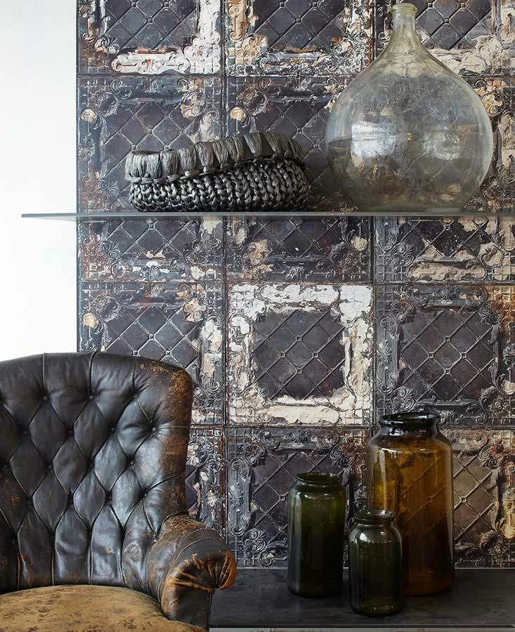 Großflächige Emaille-Kacheln mit eingeprägten Mustern sind ein ungewöhnlicher Wandschmuck mit einer unwiderstehlichen Ästhetik. Die Emaille-Kachel-Imitation aus dem Hause NLXL, im Digitaldruck auf eine Vliestapete gebannt, gibt Ihnen die Möglichkeit, mit ihrer antiken Ausstrahlung Ihre Einrichtung im Industrial Look oder im Shabby Chic ganz unkompliziert zu perfektionieren. Die graubraune Emailleschicht, in der sich keine Stelle wiederholt, und die vielen Spuren der Abnutzung geben der Tapete ihren beeindruckenden Look.
