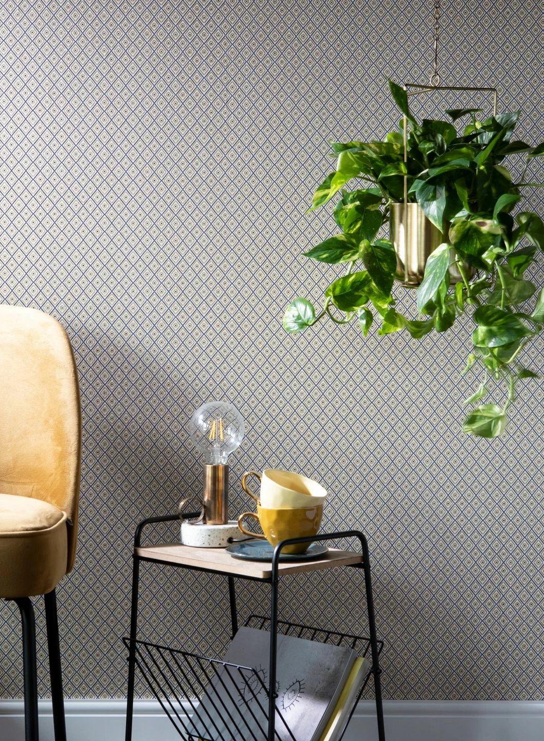 Eine Textiltapete voller Schick ist Calaluna mit ihren edlen Kettfäden, die wie ein feines Relief spürbar sind und den Gewebecharakter betonen. Aus dunkelblauen und weißen Fäden entsteht ein Muster von gleichmäßig angeordneten Rauten. Mattgoldene Fäden heben das Muster hervor und sorgen für einen sanften Schimmer in Ihren vier Wänden. Calaluna verbindet die Wärme und Stabilität des Textilmaterials mit einem Hauch von luxuriöser Eleganz.