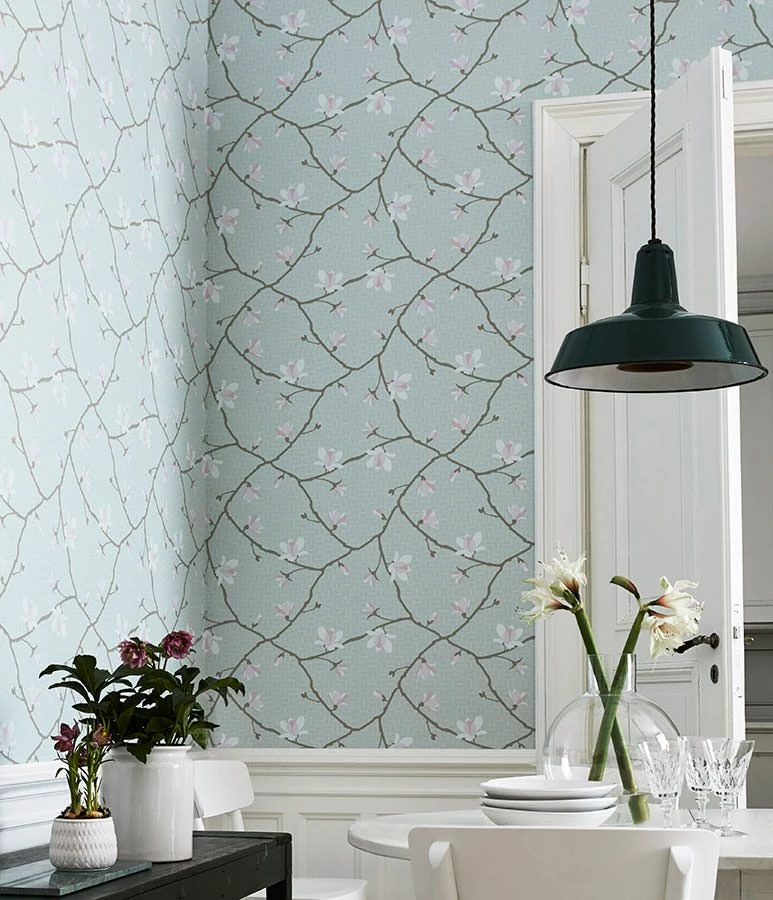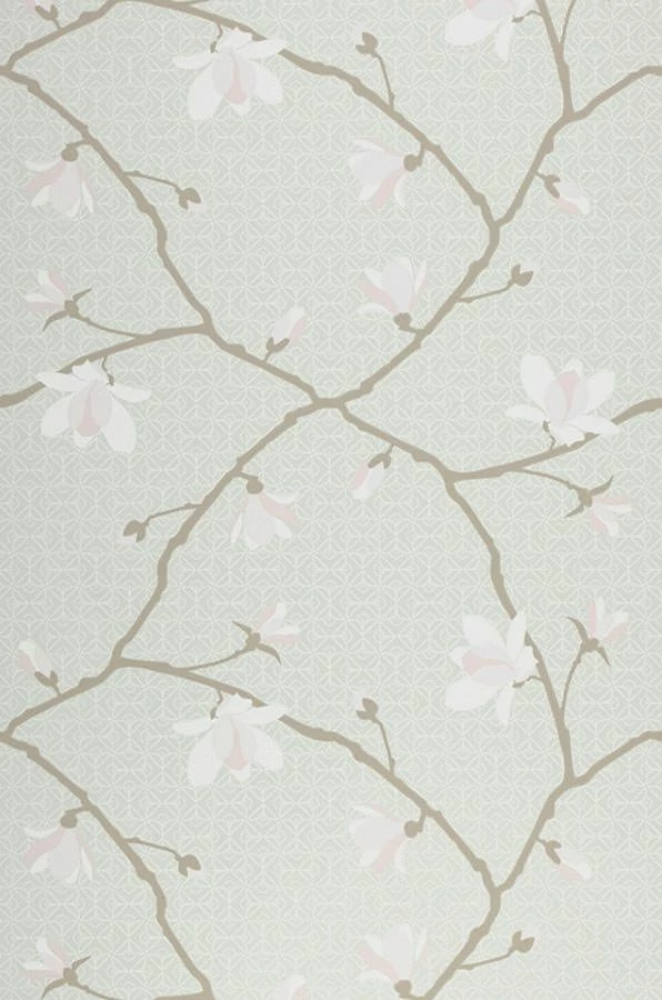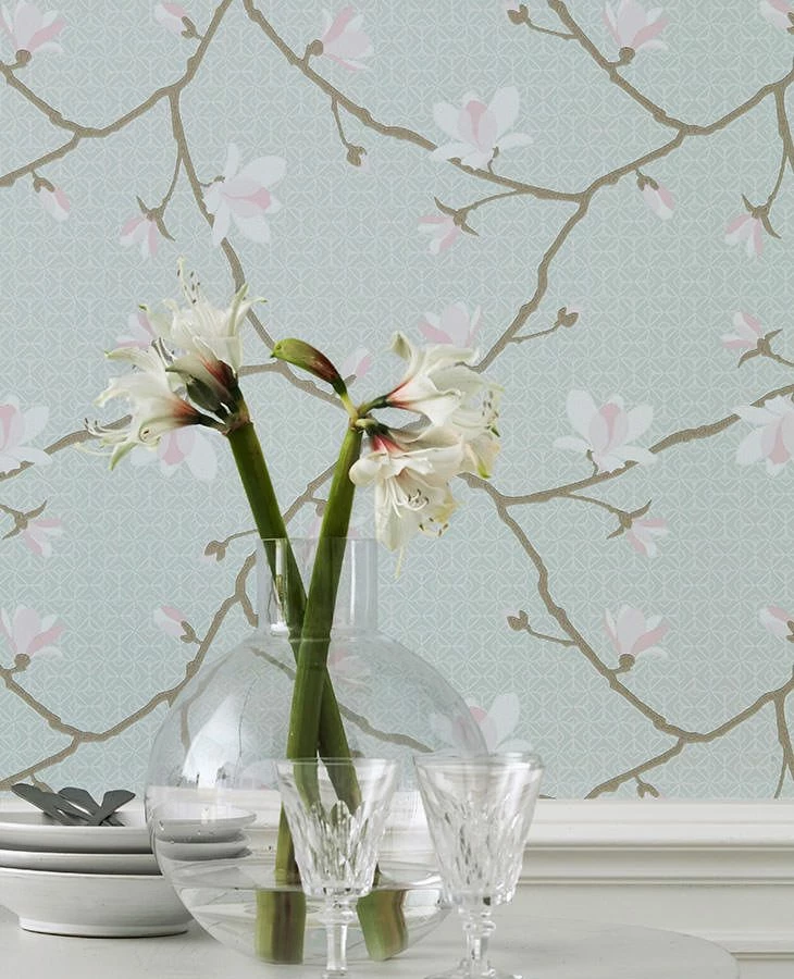 Ein Zauber, dem sich niemand entziehen kann, geht von den großen Blüten der Magnolie aus. Die Vliestapete „Calista“, hergestellt im Leimdruckverfahren, fängt diesen Zauber auf unnachahmliche Weise ein. Auf dem blassmintgrünen Grund ziehen die auffälligen, zartrosa und weiß gefärbten Blüten an den graubeigefarbenen Zweigen die ganze Aufmerksamkeit auf sich – so wie auch in der Natur, wo die Magnolienblüten sich öffnen, bevor die Blätter erscheinen.