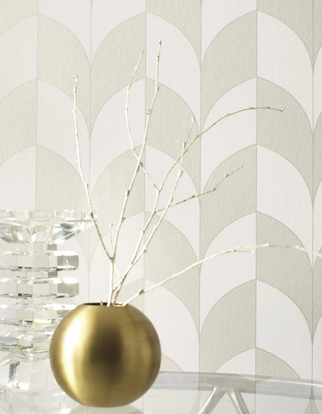 Anregende Leichtigkeit und strenge Symmetrie müssen sich nicht widersprechen wie die glamouröse Design Tapete im Mustermix zeigt. Fließende Bögen im Art Deco Stil avancieren zu einem Blockstreifenmuster und füllen den Raum mit subtiler Bewegung. Die samtig schimmernden Farben Cremeweiss, Perlbeige, Creme Perlglanz unterstreichen Klarheit und Helligkeit.