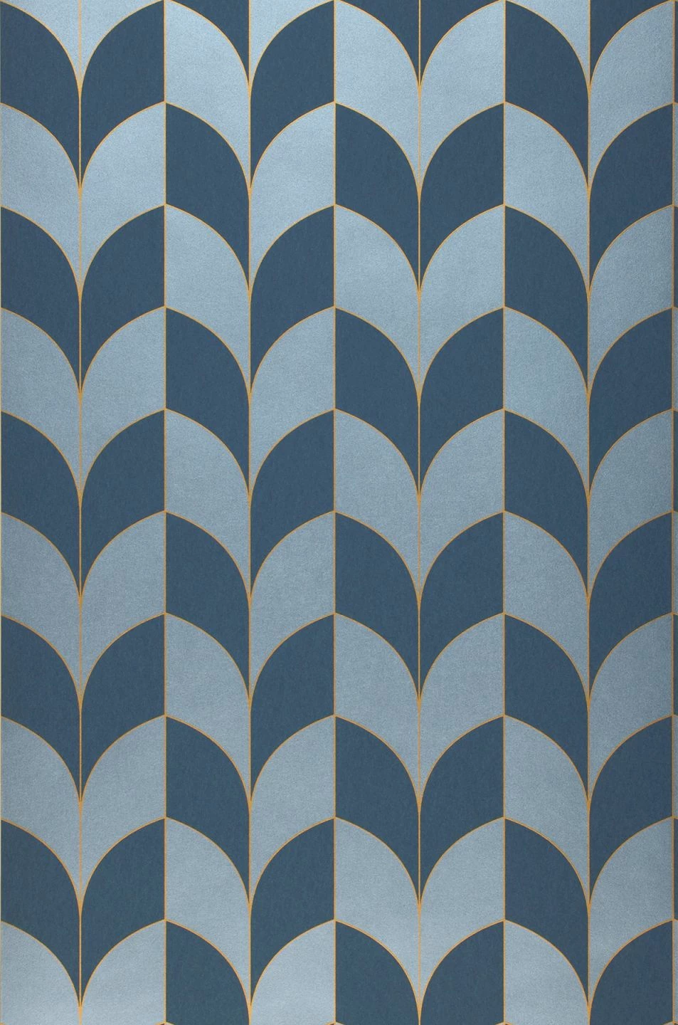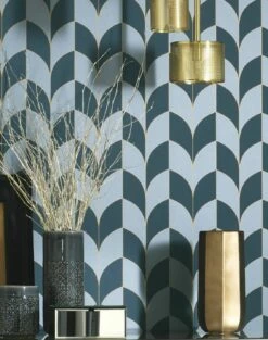Die künstlerische Freiheit des Art Deco spiegelt sich in Designtapete Caprice im dynamischen Mustermix wieder. Halbbögen und Streifen zaubern fließende Bewegung in den Raum. Die erlesene Farbkomposition in Grünblau wird mit Goldgelb für einen glamourösen Look verfeinert.