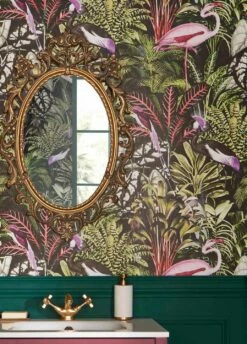 Tropische Pflanzen mit schön geformten Blättern in Hülle und Fülle zaubern einen exotischen Garten an Ihre Wände. Inmitten der verschiedensten Blattpflanzen finden sich Flamingos, Kronenkraniche und Paradiesvögel mit bunt leuchtendem Gefieder. In einem Raum, der mit diesem ausdrucksstarken Wandschmuck in kräftigen Grün-, Rosa- und Rottönen auf dunklem Grund ausgestattet ist, fällt es leicht, sich aus dem Alltag in ein karibisches Paradies zu träumen.