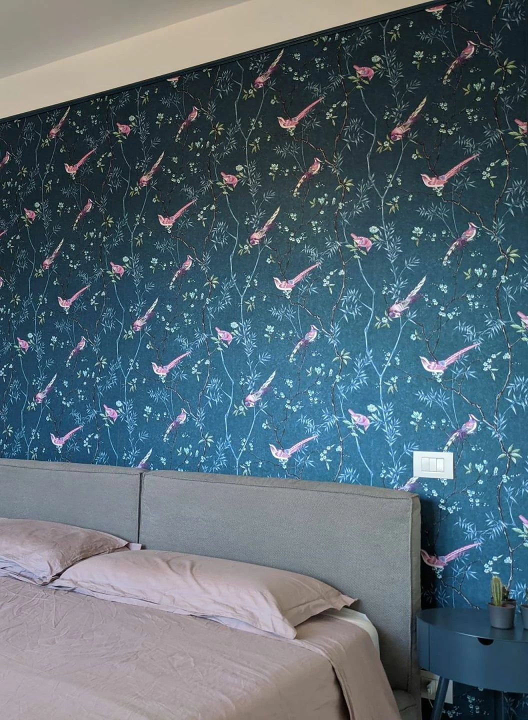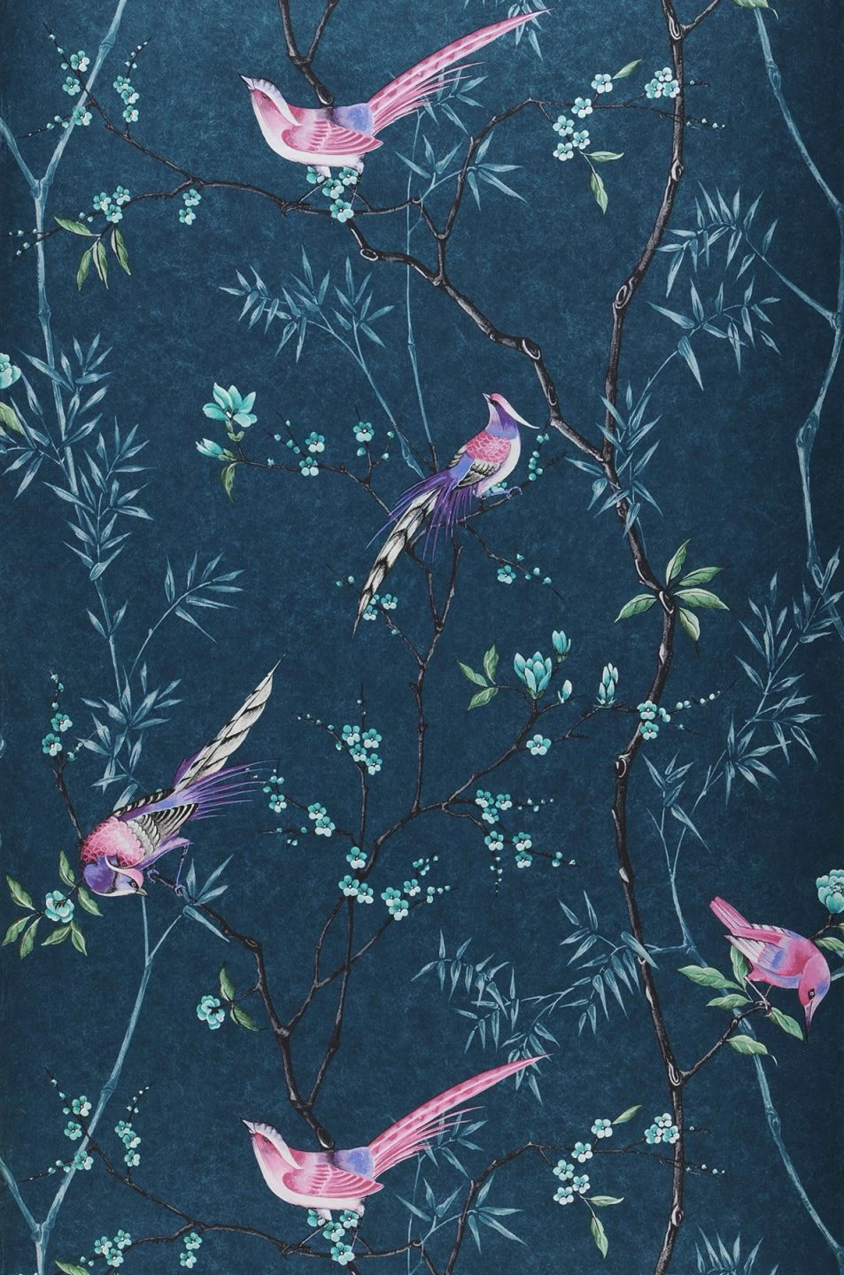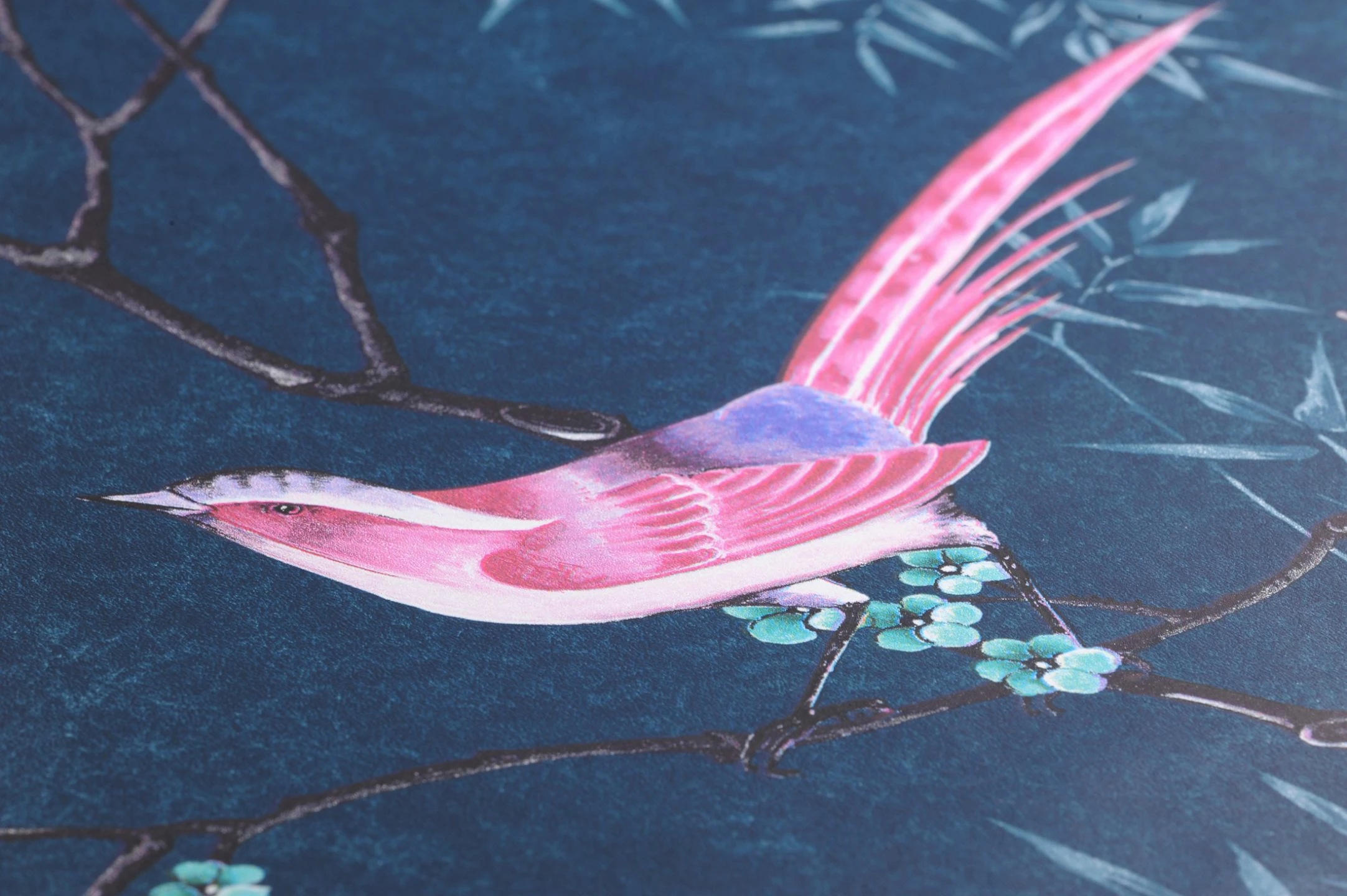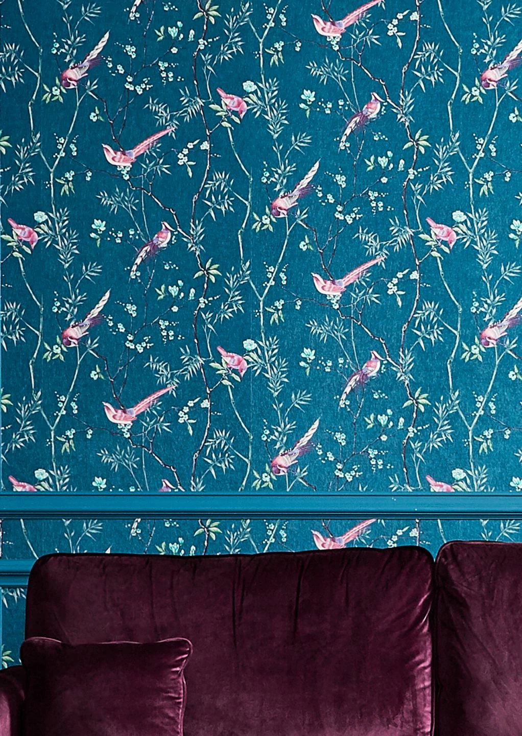 Die exotischen Paradiesvögel in Violett und Rosa tummeln sich in eifriger Geselligkeit auf leichten Zweigen mit zarten Blüten. Ozeanblau in Verbindung mit Türkis verleiht der Tapete im romantischen Stil einen sinnlich magischen Charakter. Entdecken Sie die großen und kleinen Geheimnisse, die sich hier verbergen in Räumen, die der Muße und Entspannung dienen.