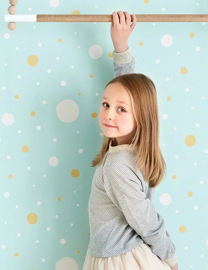 Auf dem hellgrünen Fond regnet es pastelliges Konfetti in Blassbeige, Cremeweiss, Ockergelb. Diese Farbvariante der Designer Tapete aus dem Hause Majvillan lässt Kreativität, Tatendrang und Freude sprudeln und bleibt dennoch auf ihre Art romantisch verträumt.