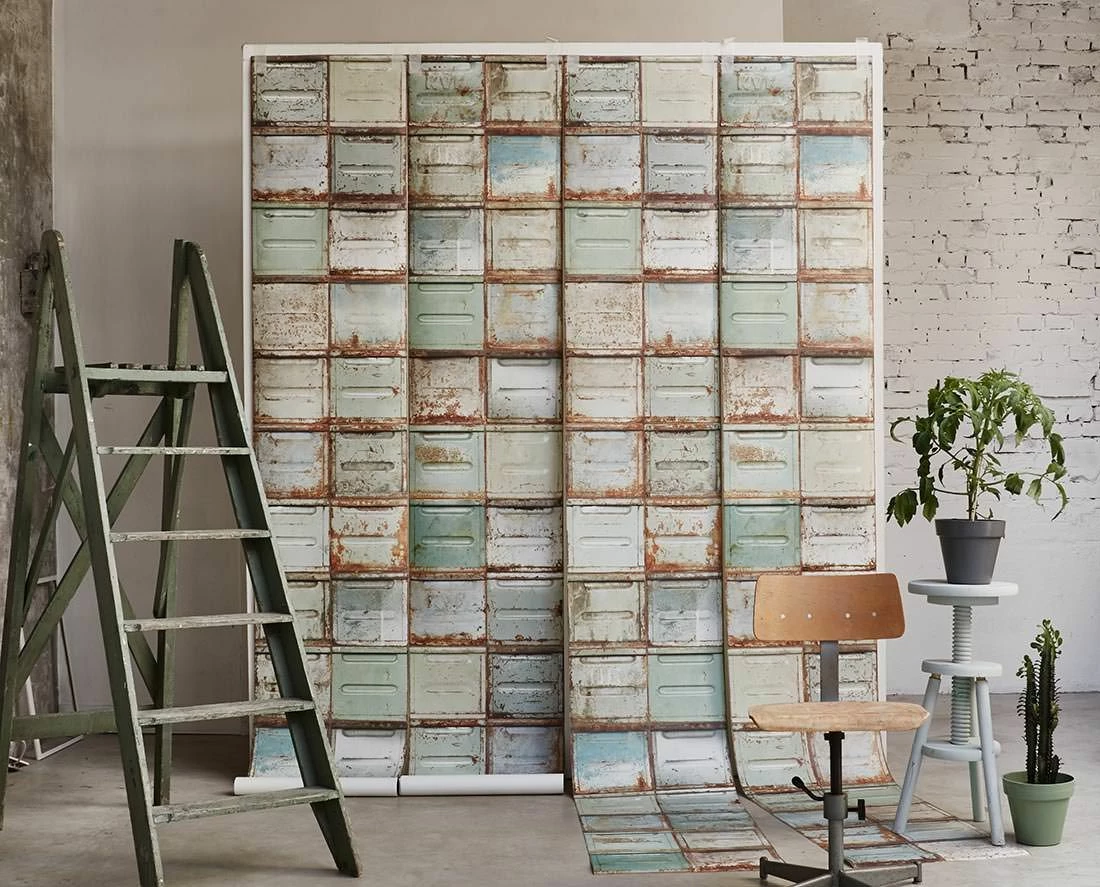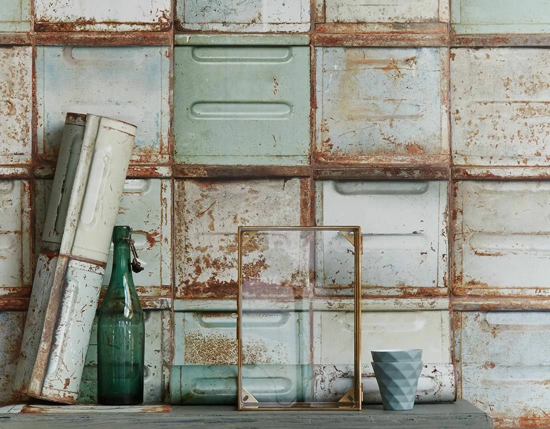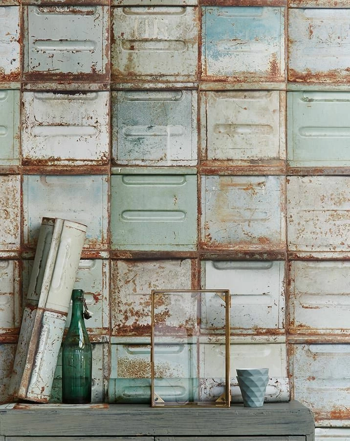 Die optische Illusion eines alten Aufbewahrungs-Containers, der in einer Werkstatt oder Industriehalle gestanden haben könnte, wird mit dieser raffinierten Designertapete perfekt. Dreidimensional und von den Spuren der Zeit gezeichnet, präsentiert sich das Mustermotiv in Blassgrün, Grauweiss, Orangebraun und Sepiabraun, mit dem sich Wände und Möbel stilgerecht verkleiden lassen.