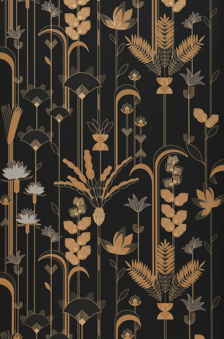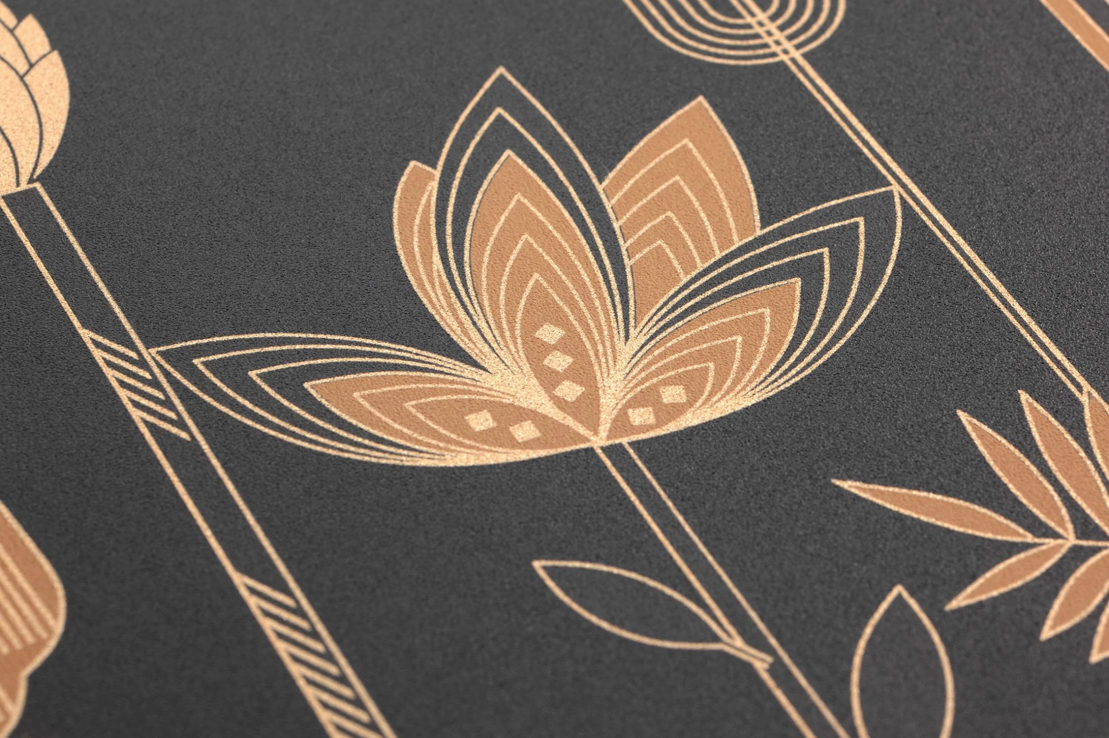 Verspielt und reich an filigranen Details sind die stilisierten Blumen und Blätter des Tapetendesigns. Doch gleichzeitig sind ihre Formen von geraden Linien und präziser Symmetrie geprägt, wie es dem Geschmack des Art Deco entspricht. In Verbindung mit dem dunkel schwarzgrauen Grund leuchten die braunbeigen, grauen und goldenen Elemente der Pflanzen wie von selbst. Die Tapete mit einer Oberfläche aus scheuerbeständigem Vinyl schmückt auch Ihr Badezimmer mit einem eleganten Flair.