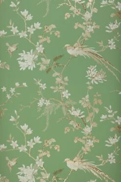 Große Vögel mit prachtvollen Federn, zarte Zweige mit filigranen Blüten und Blättern verbreiten orientalisches Flair. Die Farbkombination aus dem grünen Grund und den dezenten Grau- und Brauntönen, Weiß und Perlgold im Muster wirkt zurückhaltend und kostbar zugleich. Diesen Eindruck verstärkt die angewandte Leimdrucktechnik, die Vliestapete Coringa eine hochwertige, handgearbeitete Anmutung verleiht.