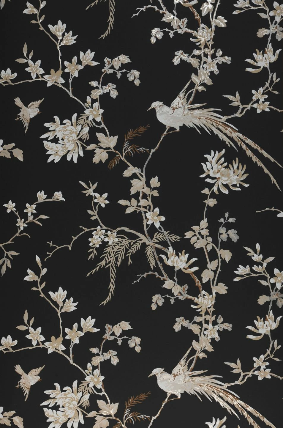 Helle, zarte Musterfarben mit einem leichten Schimmer auf dem matten schwarzen Untergrund verleihen Coringa ein edles Äußeres. Die anmutigen Vögel mit ihren langen Schwanzfedern und die Zweige voller Blätter und Blüten bringen den orientalischen Stil in seiner absoluten Luxus-Ausführung zu Ihnen nach Hause. Besonders kostbar wirkt die Tapete durch den Farbauftrag im Leimdruckverfahren mit seinem Charme traditionellen Handwerks.