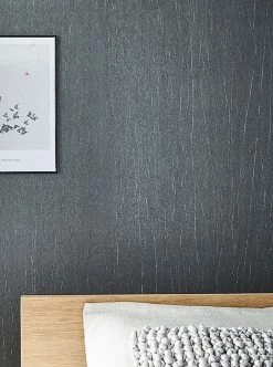 Tief dunkelgrau mit einer Oberfläche, die optisch an eine Schieferwand erinnert, ist die Crush-Tapete mit den wie zufällig angeordneten senkrechten Falten, die fühlbar in das Oberflächenmaterial eingearbeitet sind. Doch das ist nicht alles: Ein wenig silberner Glitter hier und da betont die Struktur der Tapete, hebt stellenweise den Verlauf der Falten hervor und gibt der dunklen Grundfarbe funkelnde Glanzlichter.