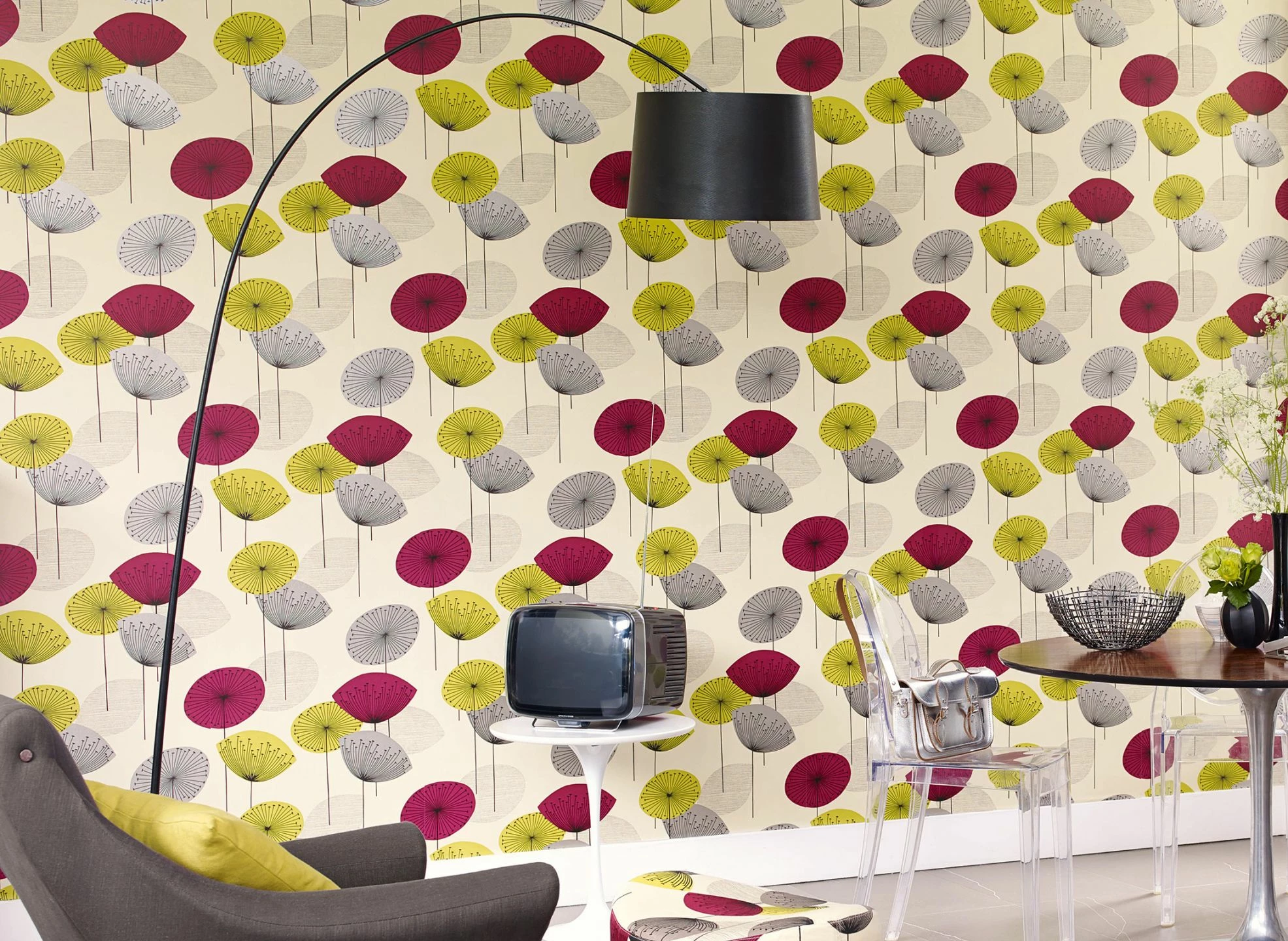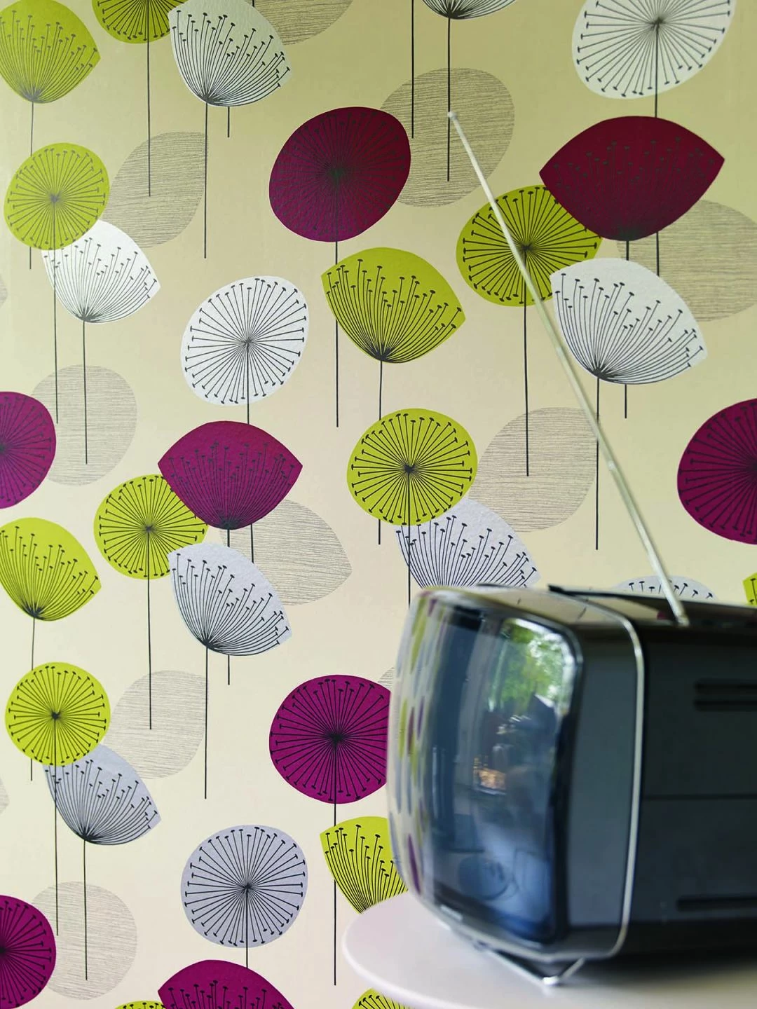 Beigegrau Schimmer, Bordeaux, Gelbgrün und Grau als Musterfarben bringen die stilisierten Löwenzahnblüten ordentlich in Bewegung und verstärken den poppigen Charakter der Vintage Tapete. Angelehnt an die Kultmuster der 50er und 60er Jahre, ist diese blumige Gute-Laune-Tapete für ausgefallene Retrostyles mehr als offen.