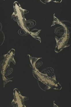 Die berühmten Koi-Karpfen, in der japanischen Kultur das Symbol für Stärke, Ausdauer und Erfolg, standen Pate für das Design dieser ungewöhnlichen Vliestapete. Wie beim Blick in einen Teich sind die eleganten Fische von oben und in natürlich anmutenden Schwimmbewegungen abgebildet. Der goldfarbene Schimmer des Musters auf dem anthrazitfarbenen Grund lässt die Tapete edel wirken – ideal für eine exklusive Einrichtung im asiatischen Stil.