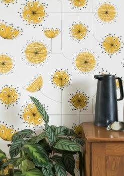 Gelbe Kreise und Halbkreise, Schraffuren in Weiß und schwarze Linien bilden stilisierte Blumen und schlagen eine Brücke zwischen dem leuchtenden Gelb, mit dem die Blüten des Löwenzahns im Frühling die Wiesen übersäen, und den federleichten Samen, die die Pusteblume in alle Windrichtungen schickt. Die helle, fröhliche Vliestapete verbreitet sonnige Frühlingsstimmung und ist an Ihren Wänden ein echter Hingucker.