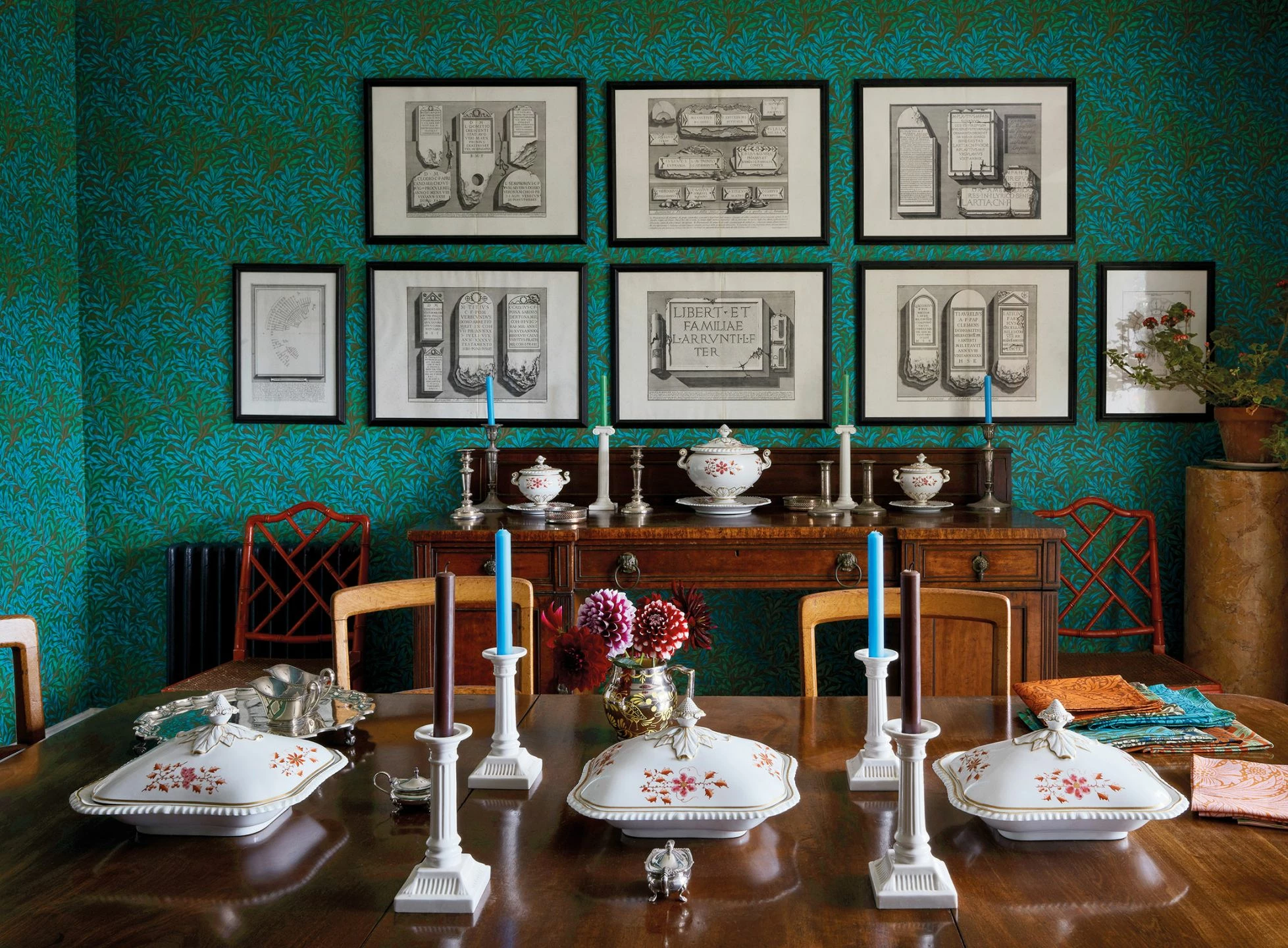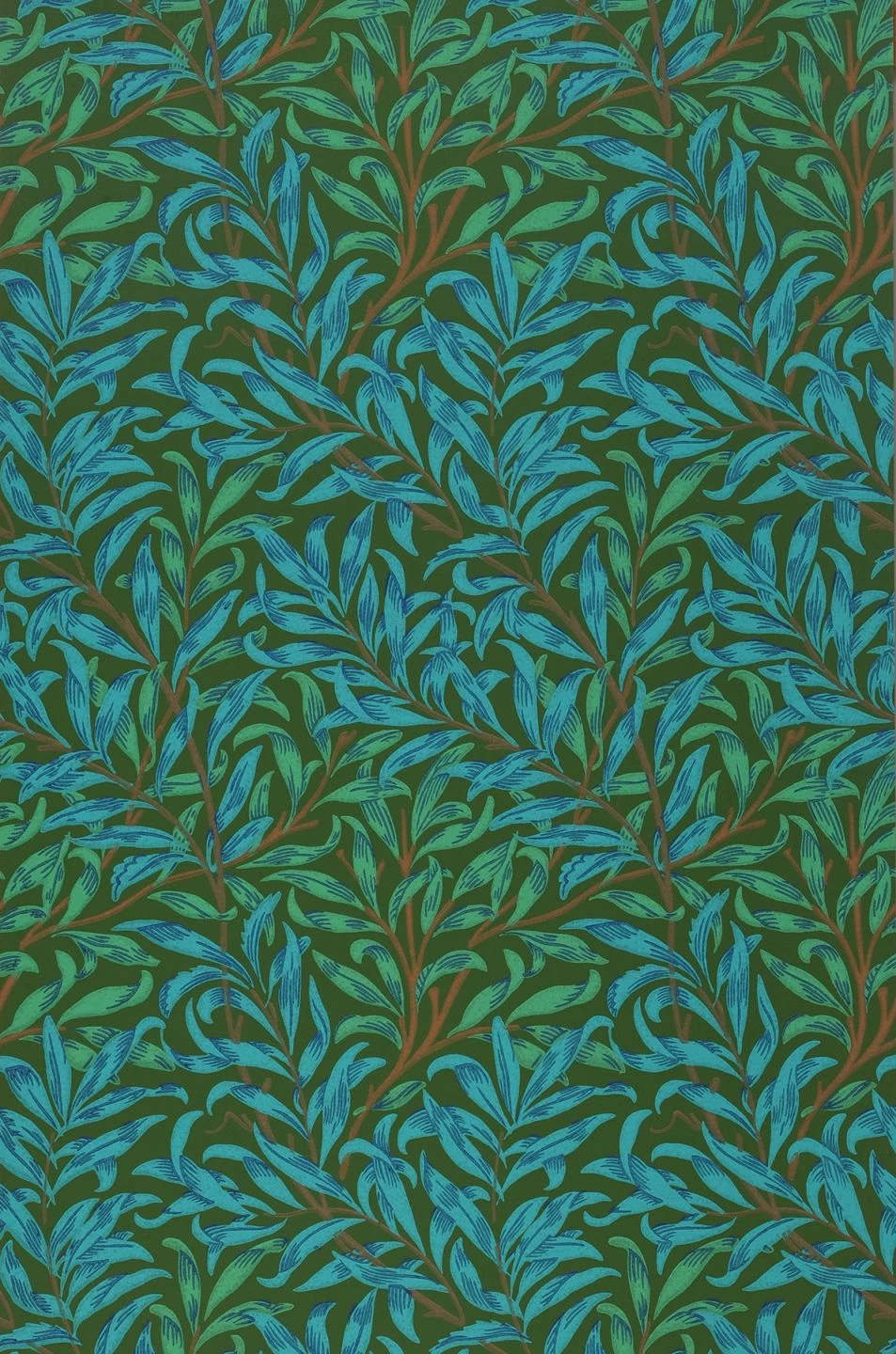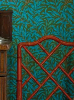 Intensiv türkis und blau sind die schlanken Blätter, die die Papiertapete wie ein dichtes Gebüsch bedecken. In Verbindung mit der olivgrünen Grundfarbe entwickeln die Farben eine große Strahlkraft. Die Tapete ist im Leimdruckverfahren hergestellt und strahlt durch diese traditionelle Drucktechnik den Charme des Handgemachten aus. „Darcie“ passt zu warmen Holztönen und zu antiken Möbeln besonders gut.