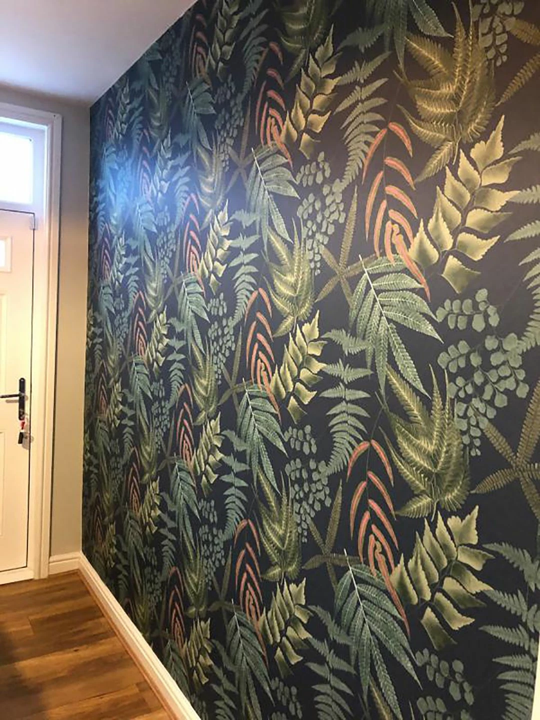 Fein verästelte Farnblätter in ihrer ganzen Formenvielfalt erzeugen eine Atmosphäre von Ruhe und Geborgenheit. Die verschiedenen Nuancen von Grün entfalten auf dem graublauen Hintergrund der Vliestapete ihre Leuchtkraft, die von Details in Erikaviolett noch betont wird. In Verbindung mit Möbeln aus naturbelassenem Holz steht die Natur ganz im Mittelpunkt. Oder Sie greifen eine der Musterfarben auf und schaffen so eine ästhetische Einheit.