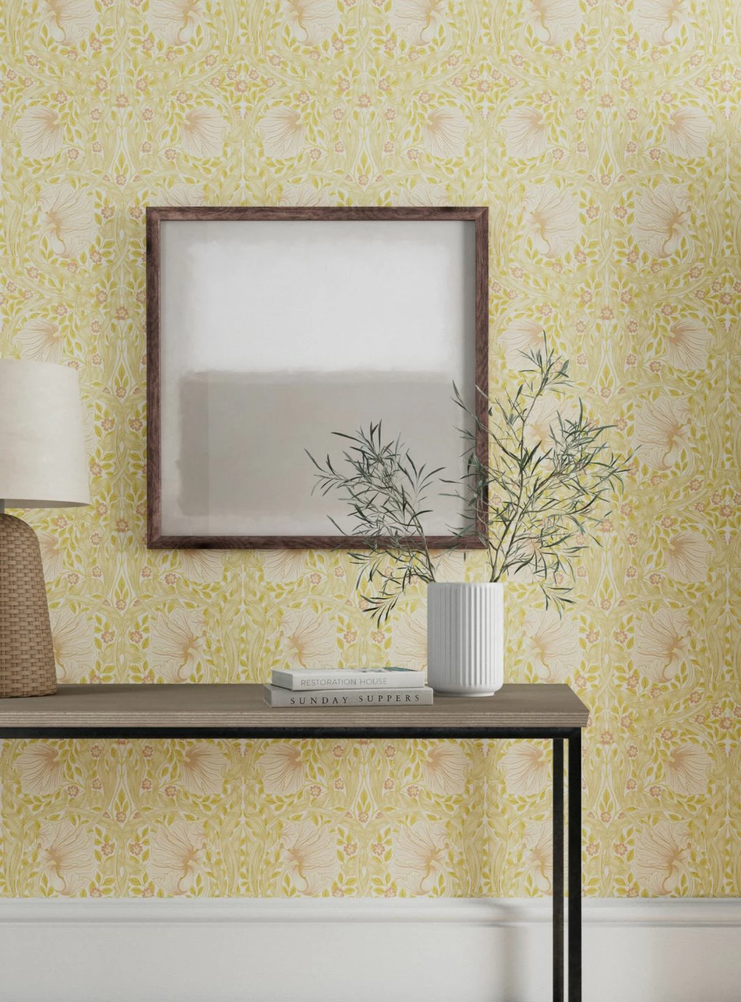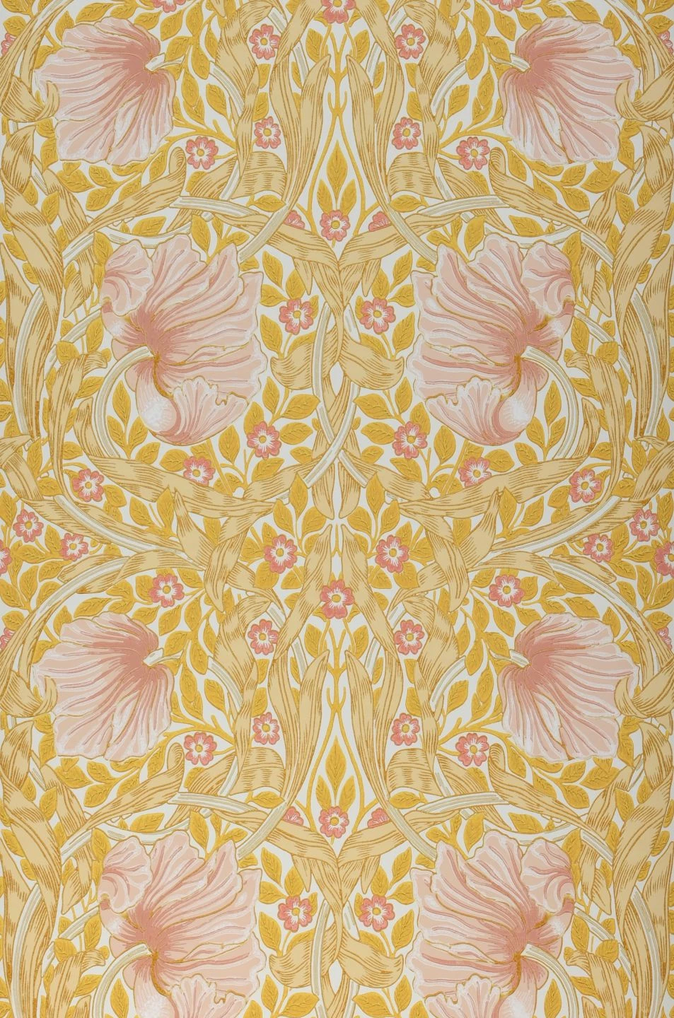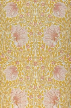 Sonniges Ginstergelb in Verbindung mit Rosatönen lässt die exklusive Jugendstil-Tapete Despina wie von selbst leuchten und taucht Ihren Raum in warme, helle Farben. Das Muster ist ein Design des britischen Künstlers William Morris und lebt von großen zarten Blüten in Altrosa, Creme und Zartrosa und den umeinander geschlungenen Blüten- und Blattranken, die den weißen Grund bedecken. Die Optik des verwendeten Leimdruckverfahrens gibt der Papiertapete ihren authentischen Charakter.