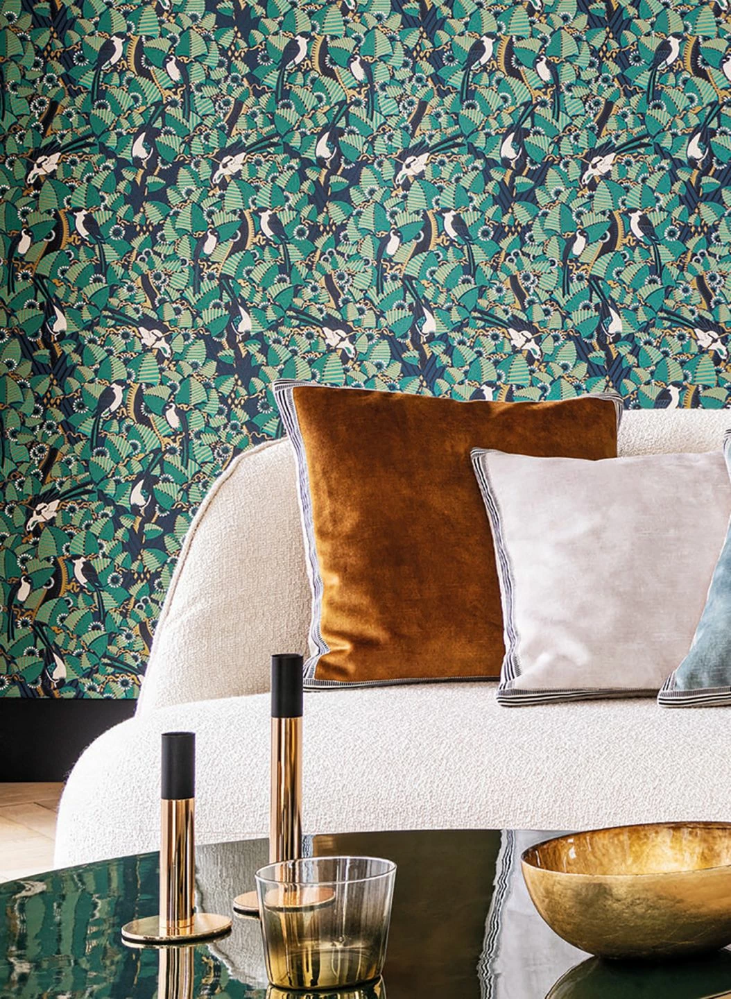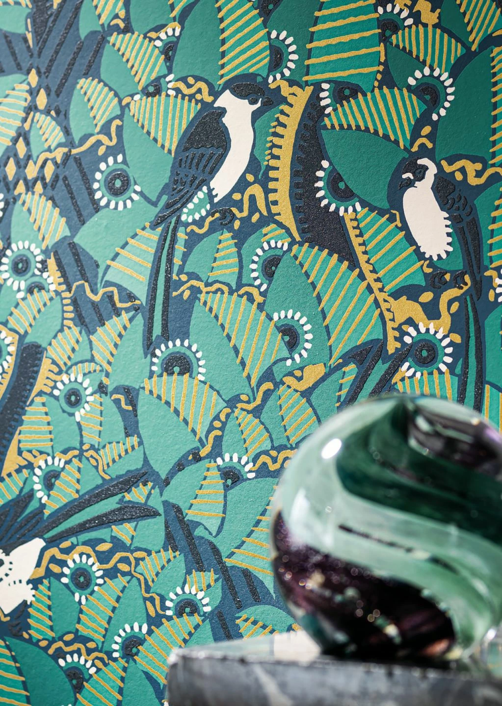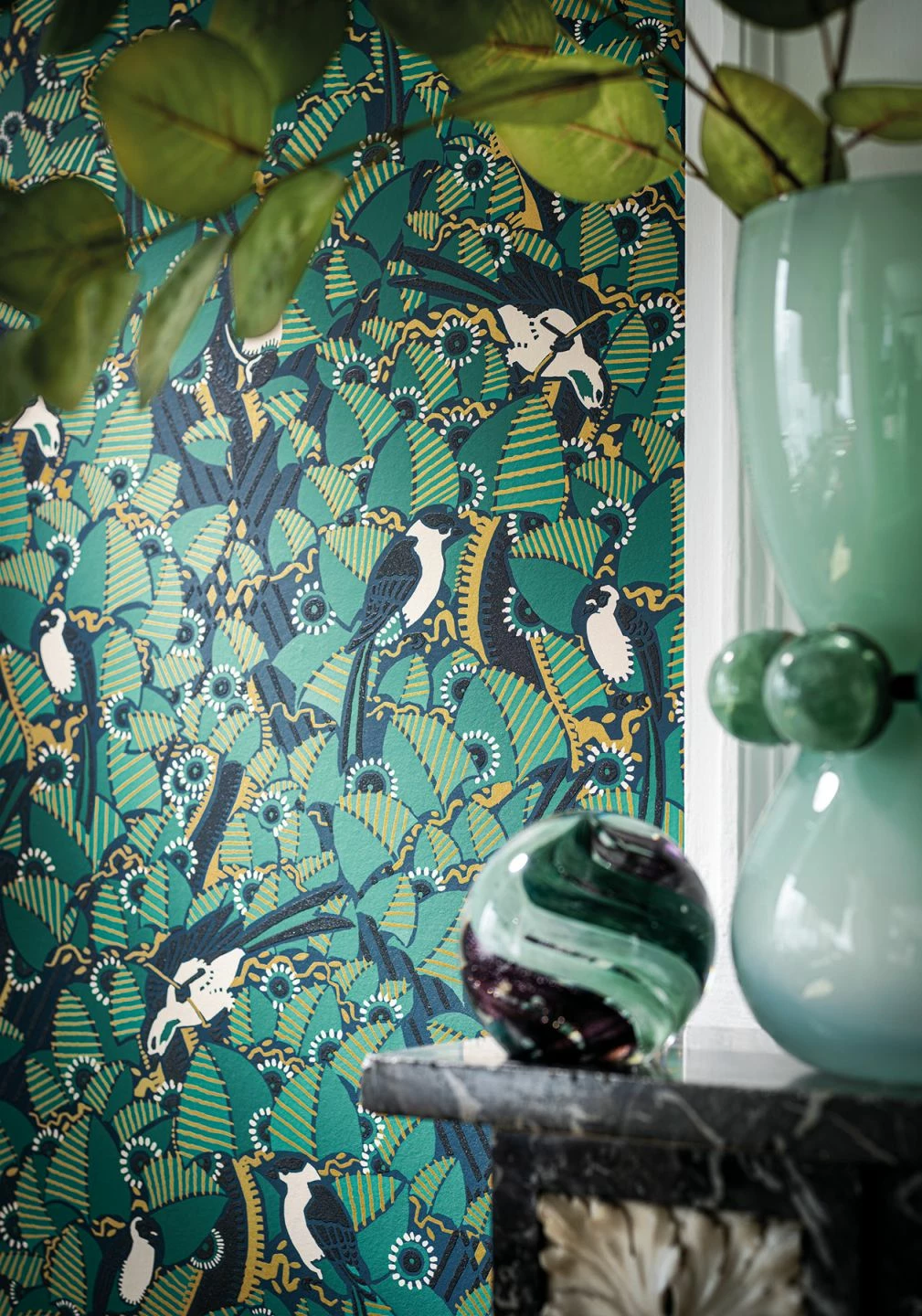 Eine Schwalbe macht noch keinen Sommer – aber wo sich so viele an Schwalben erinnernde stilisierte Vögel versammeln, kann die warme Jahreszeit nicht weit sein! Umgeben sind sie von einer wahren Fülle stilisierter Blüten und Blätter in Grüntönen. Leuchtendes Perlgold setzt auffallende Akzente. Alles in allem ist das lebhafte Design der exklusiven Art-Deco-Tapete ein Bekenntnis zur Lebensfreude. Langweilig wird es in Ihrem Zimmer damit sicher nicht!