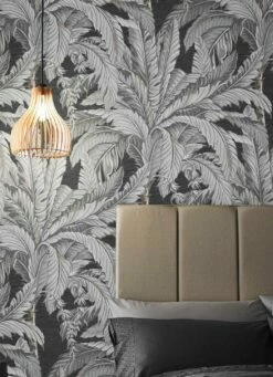 Die Grautöne, in denen die Tapete gestaltet ist, bilden einen ausgeprägten Kontrast zur üppigen Vegetation, die darauf abgebildet ist, und lässt die Palmblätter geheimnisvoll wirken. Blasses Braun liefert räumliche Tiefe, während mattes Silber schöne Akzente setzt. Mit Einrichtungselementen in Grautönen, Schwarz und Weiß setzen Sie das Design der Tapete stimmig in Ihrem Raum um. Aber auch der Kontrast kräftiger Farben ist eine tolle Möglichkeit, „Eden“ in Szene zu setzen.