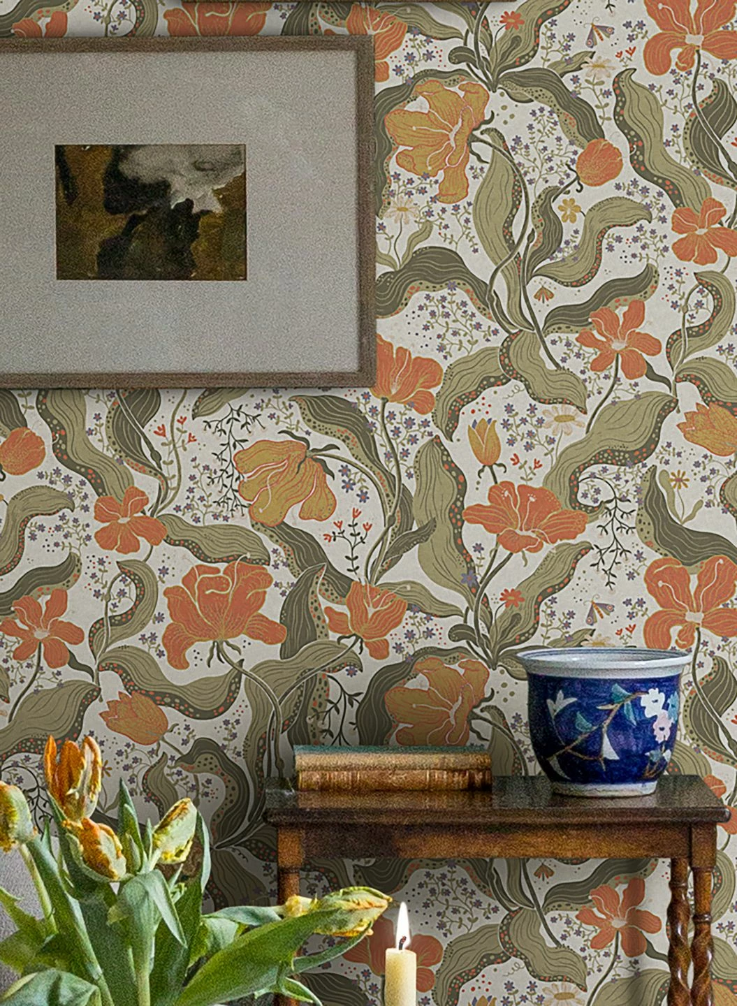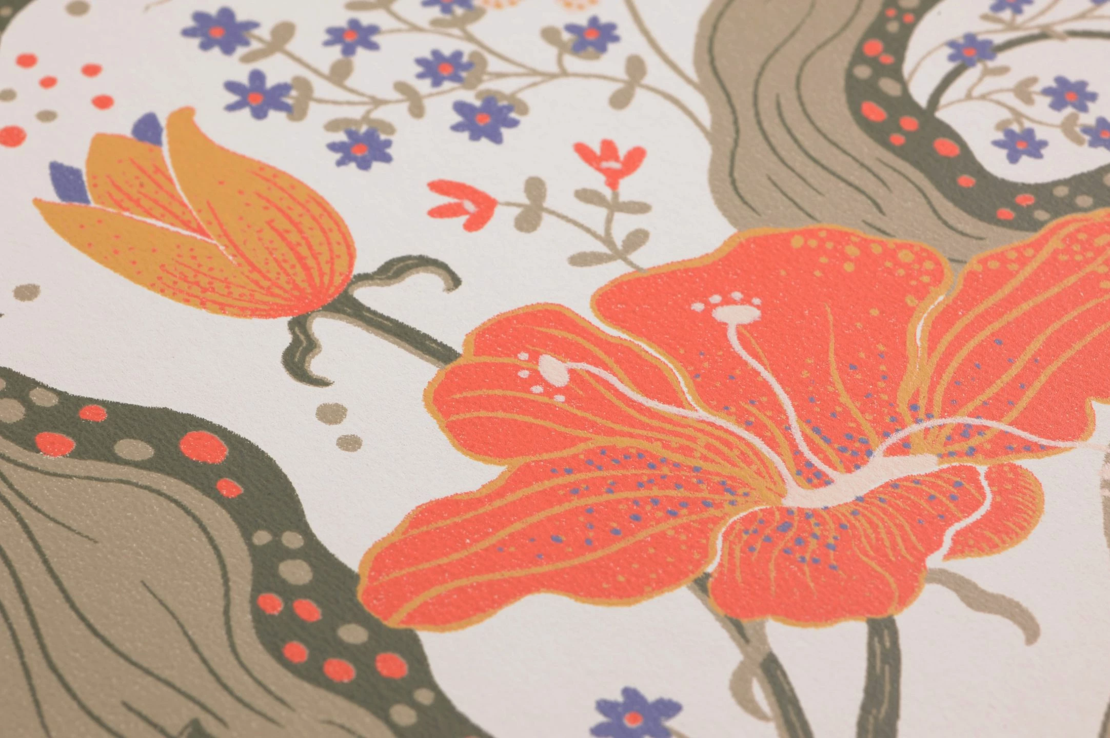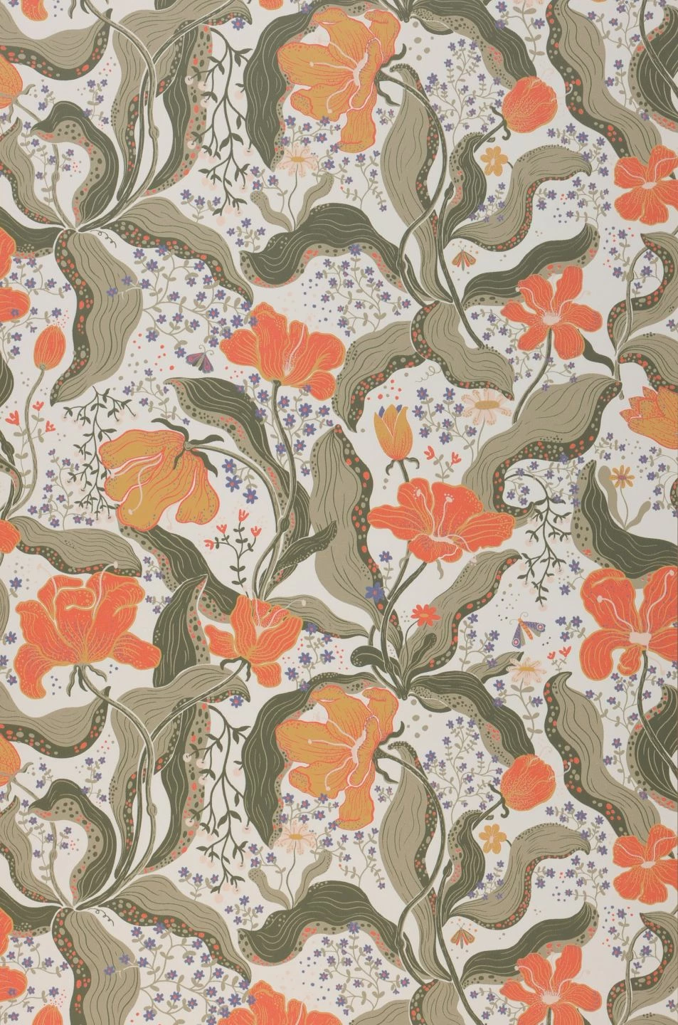 So bewegt, als würden sie in einem Windhauch tanzen, wirken die Blüten und Blätter. Im Mittelpunkt stehen das Korallenrot und Ocker der großen Blüten, während zwischen den phantastisch verschlungenen Blättern kleine violettblaue Blüten den weißen Untergrund gestalten. Expressiv und außergewöhnlich, bildet die Tapete Edvin einen lebhaften, exotischen Hintergrund für jeden Raum, den Sie damit auskleiden.