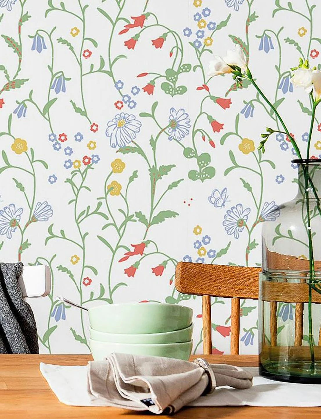 In heller Grundstimmung zeigen sich die fröhlich bunten Blumen und Schmetterlinge. Superlaune, Frische und Fröhlichkeit sind mit dieser floralen Designtapete in Leimdruckoptik garantiert. Die schwungvolle Vliestapete ist dazu noch pflegleicht und abwaschbar, was sie vielseitig einsetzbar macht.