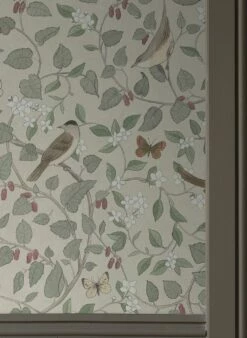 Eine botanische Tapete mit einer großen Portion von nostalgischem Schick ist Elisa. Auf geschwungenen Zweigen mit Blättern, Blüten und reifen Früchten sitzen Singvögel, dazwischen flattern Schmetterlinge. Die verwendeten Beige- und Grautöne und das Weinrot der Beeren harmonieren wundervoll mit dem hellgrauen Grund und schaffen ein attraktives Ensemble, das Vintage-Einrichtungen oder dem skandinavischen Stil eine besondere Note verleiht.