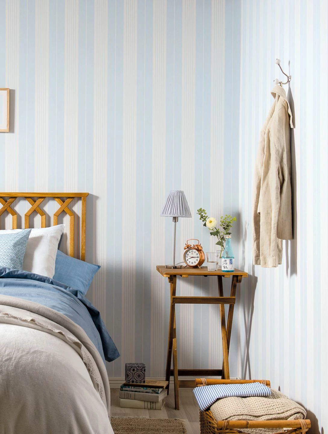 Lust auf Landurlaub am Meer? Mit dieser maritimen Streifentapete in Blau-Weiß ist das ein Leichtes. Ob Küche, Schlaf- oder Wohnzimmer: Spritzige Frische ist mit der abwaschbaren Vliestapete garantiert. Sie eignet sich übrigens auch als dekoratives Wandkleid für eine nordische Teestube sehr gut.