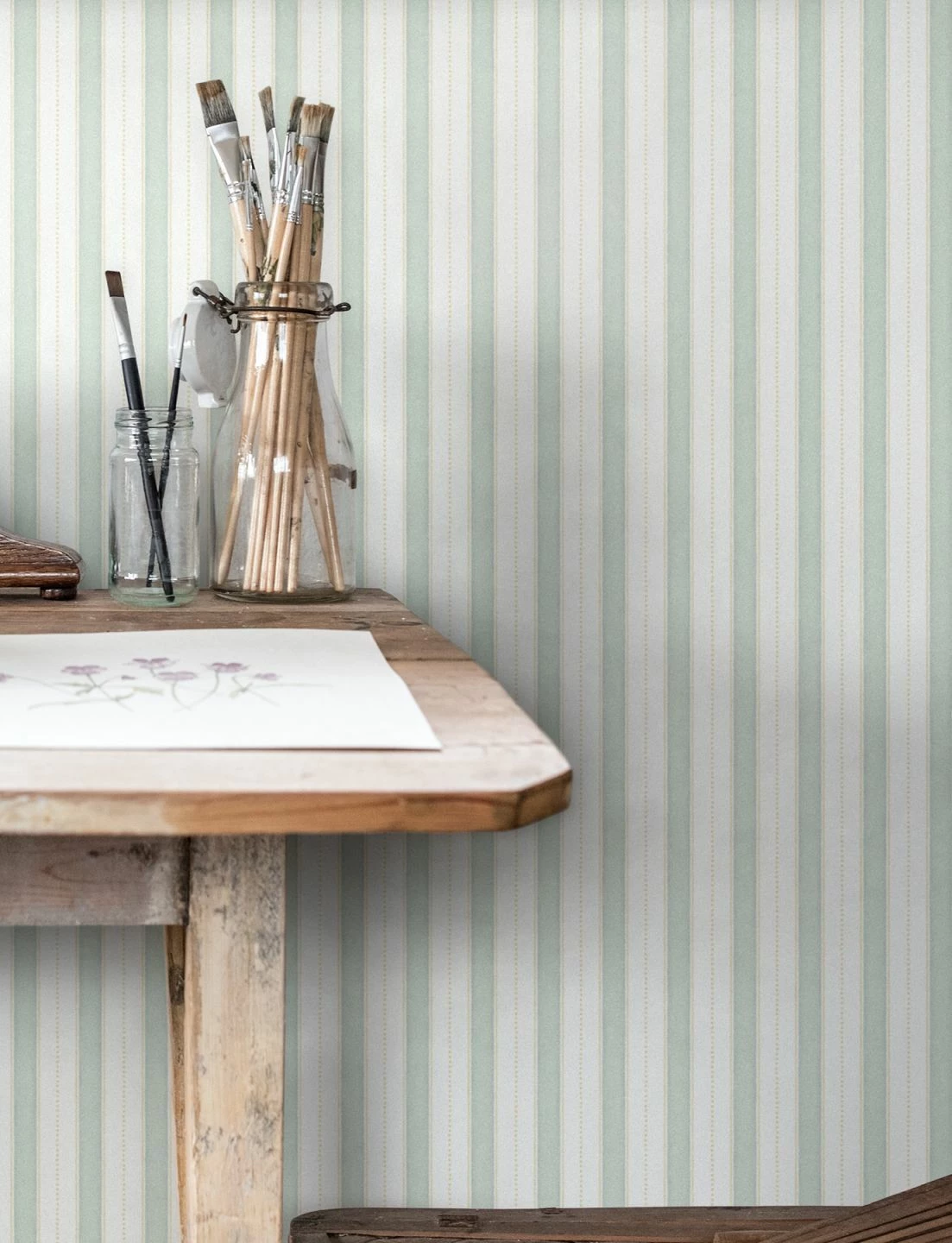 Ein klassisches Streifenmuster mit besonderer Raffinesse ziert die Vliestapete „Emeral“. Streifen in zartem Hellminttürkis wechseln sich mit weißen Streifen ab. Feine Ränder in einem hellen Gelbgrün setzen sie voneinander ab, während aus einzelnen Punkten zusammengesetzte Linien für einen angenehmen Akzent sorgen. Die Grüntöne auf dem Weiß lassen die Tapete frisch und elegant wirken, so dass sie sich jedem Zimmer ästhetisch anpasst.